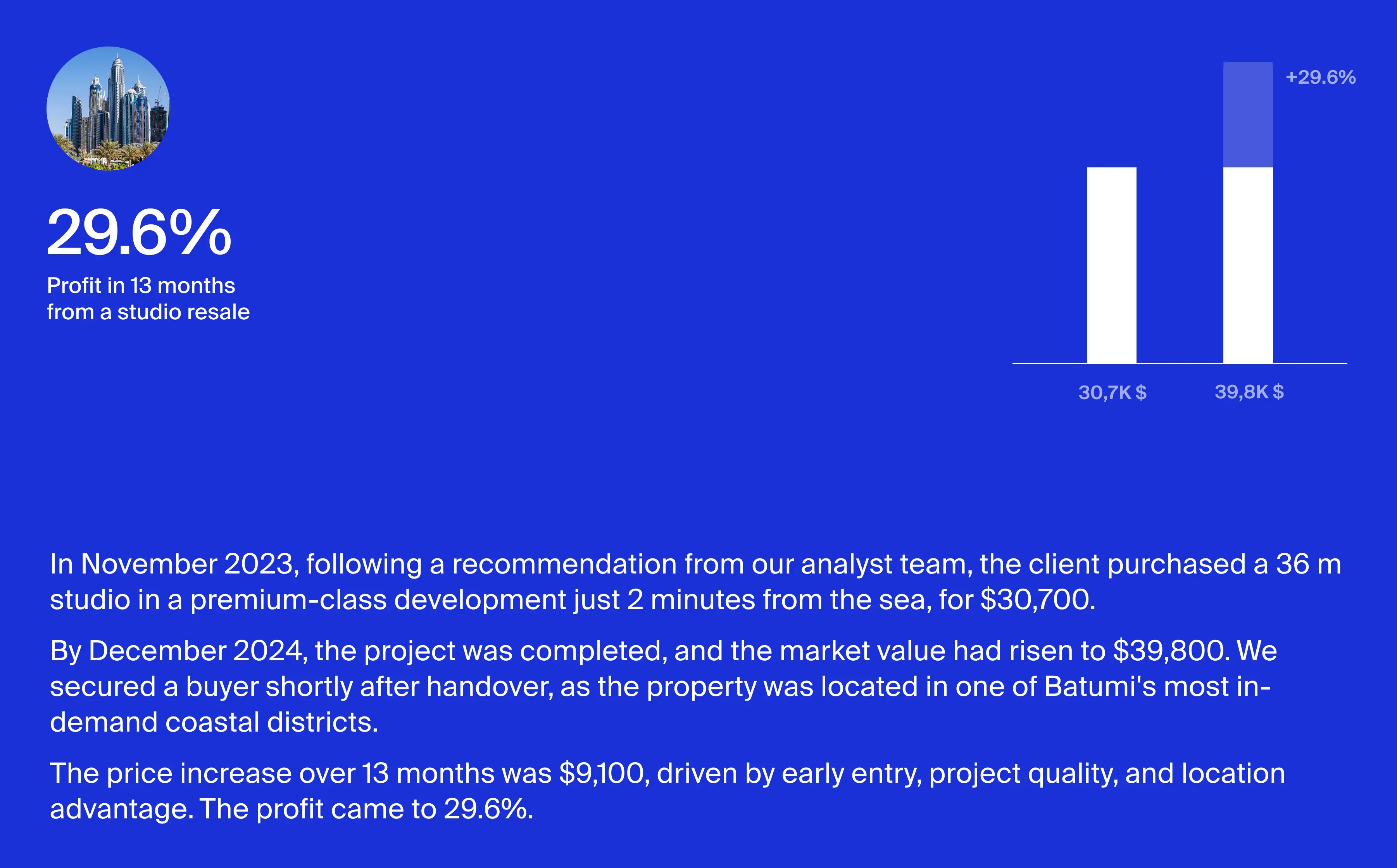 Data-led project selection – our in-house analytics team monitors the market, negotiates directly with developers, and picks projects based on performance metrics, not marketing promises.