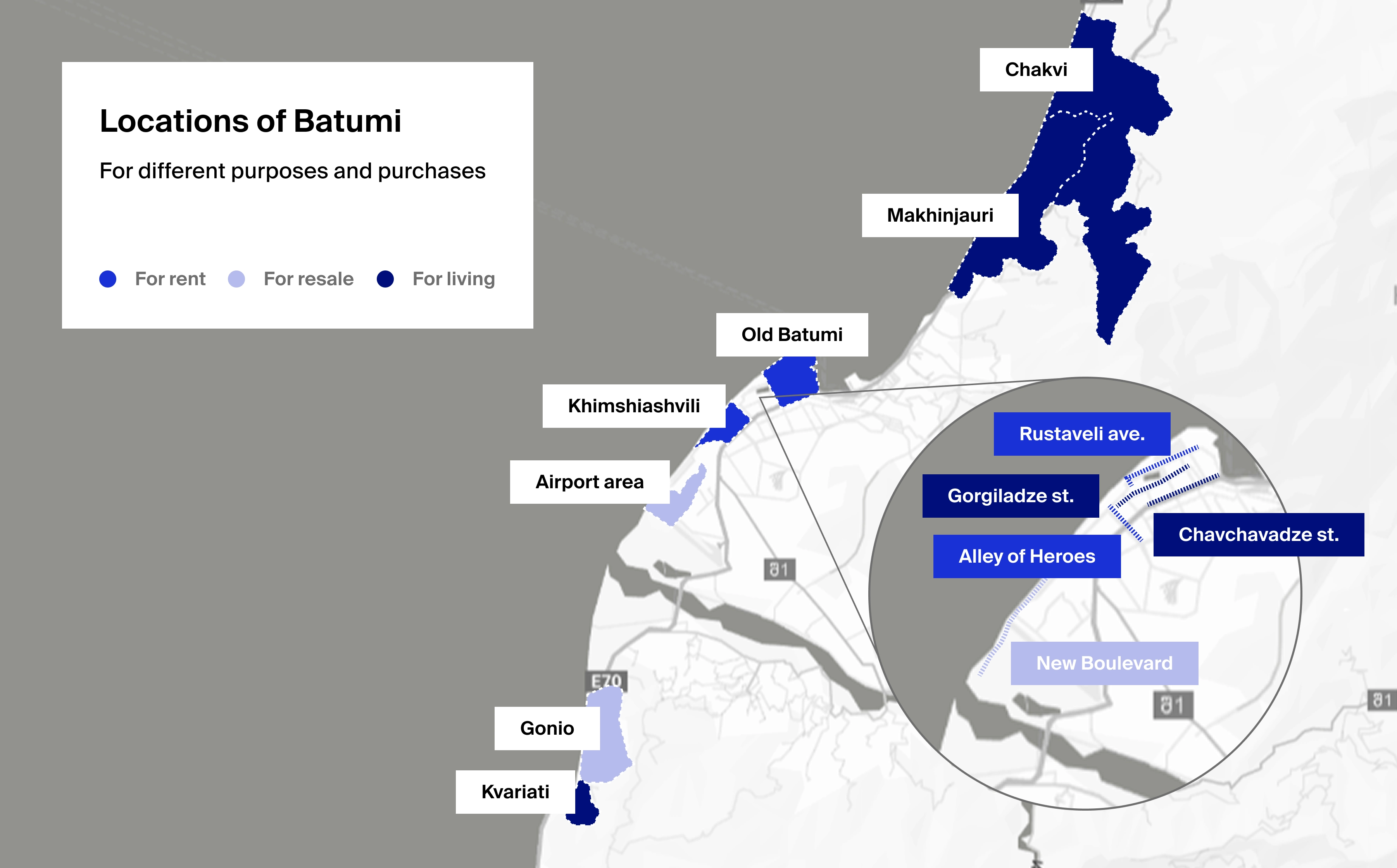 The most affordable real estate is found in the outer areas of Batumi and Tbilisi, as well as in smaller cities like Kutaisi. In Batumi, budget-friendly districts include Agmashenebeli, Bagrationi, and the Airport zone — all further from the coast, but well-connected and rising in popularity.