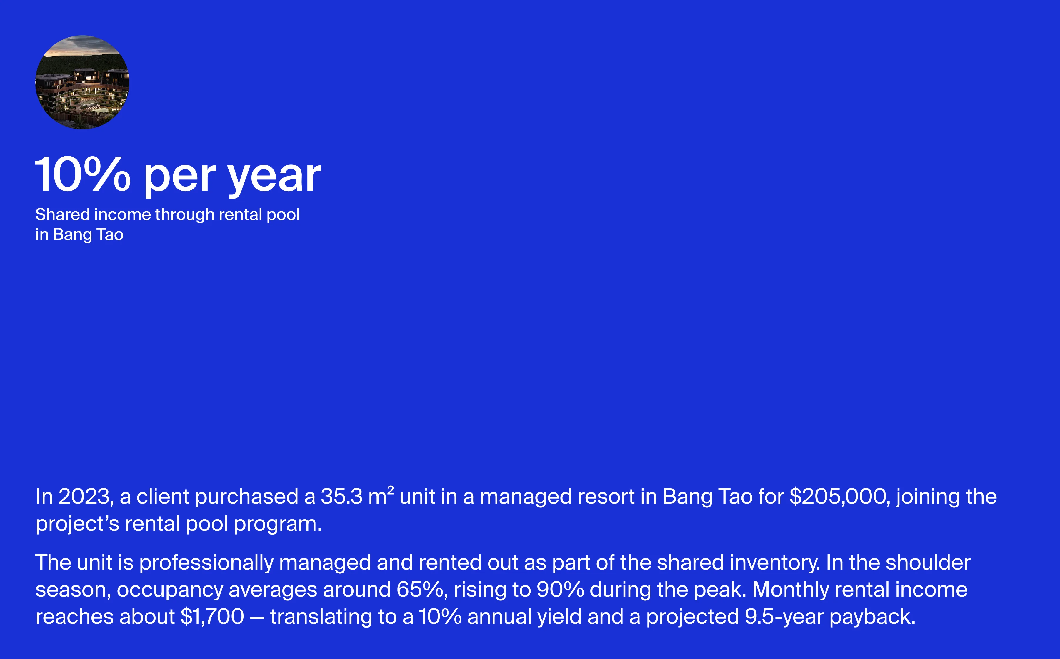 Returns in Phuket rental pools typically range from 5 to 10% annually, depending on several key factors: