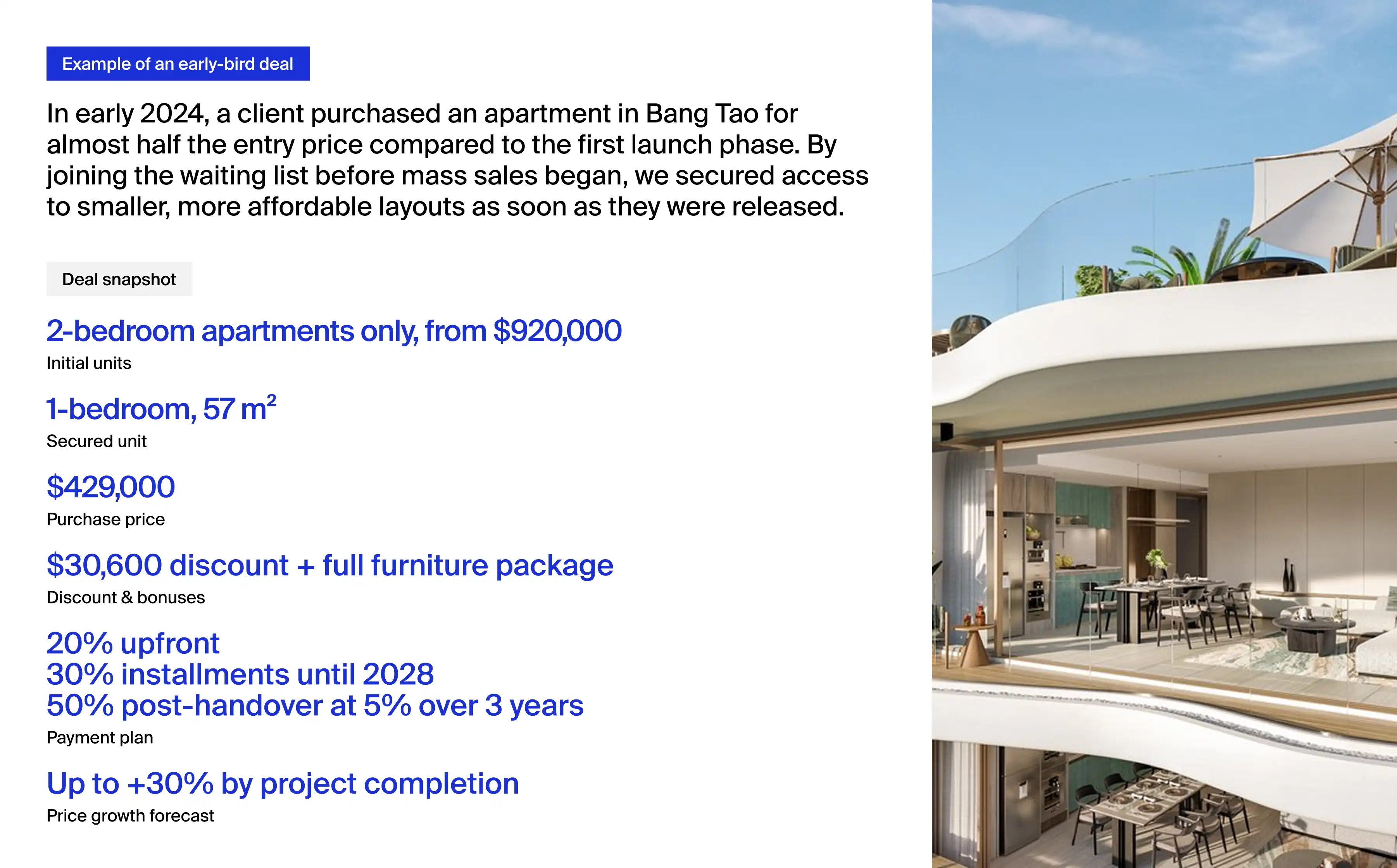 In Phuket’s highly competitive market, the first price tier often sells out within hours. At Neginski, our role is to secure that early access for investors. We do this through exclusive partnerships with leading developers, giving our clients invitations to VIP launches and pre-release selections where the best-priced units are available.