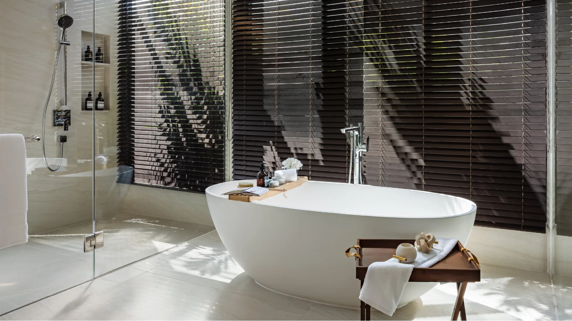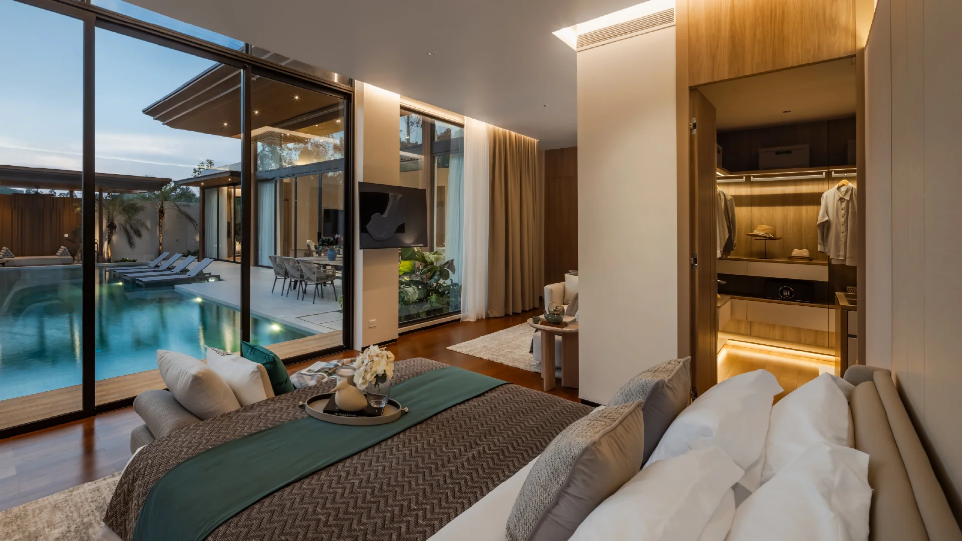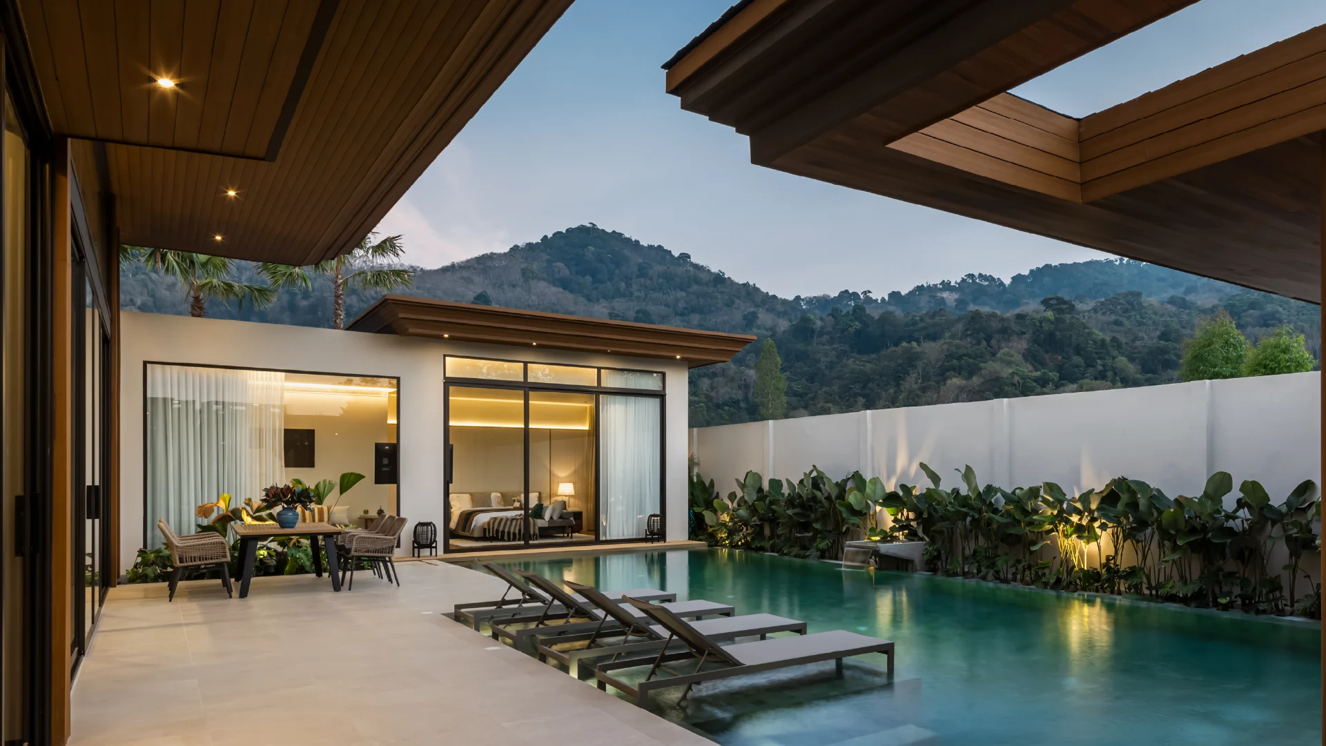 The bedrooms offer unique views of the pool and a high level of comfort. Each villa is elegantly designed with stylish bedrooms, cozy living rooms, and separate dining areas