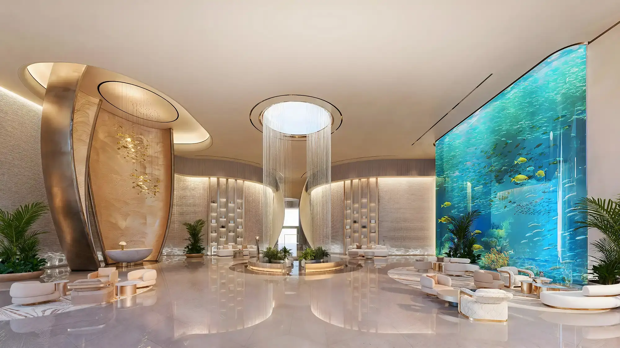 The interiors are inspired by a nautical theme, and the lobby features a 139 m² aquarium