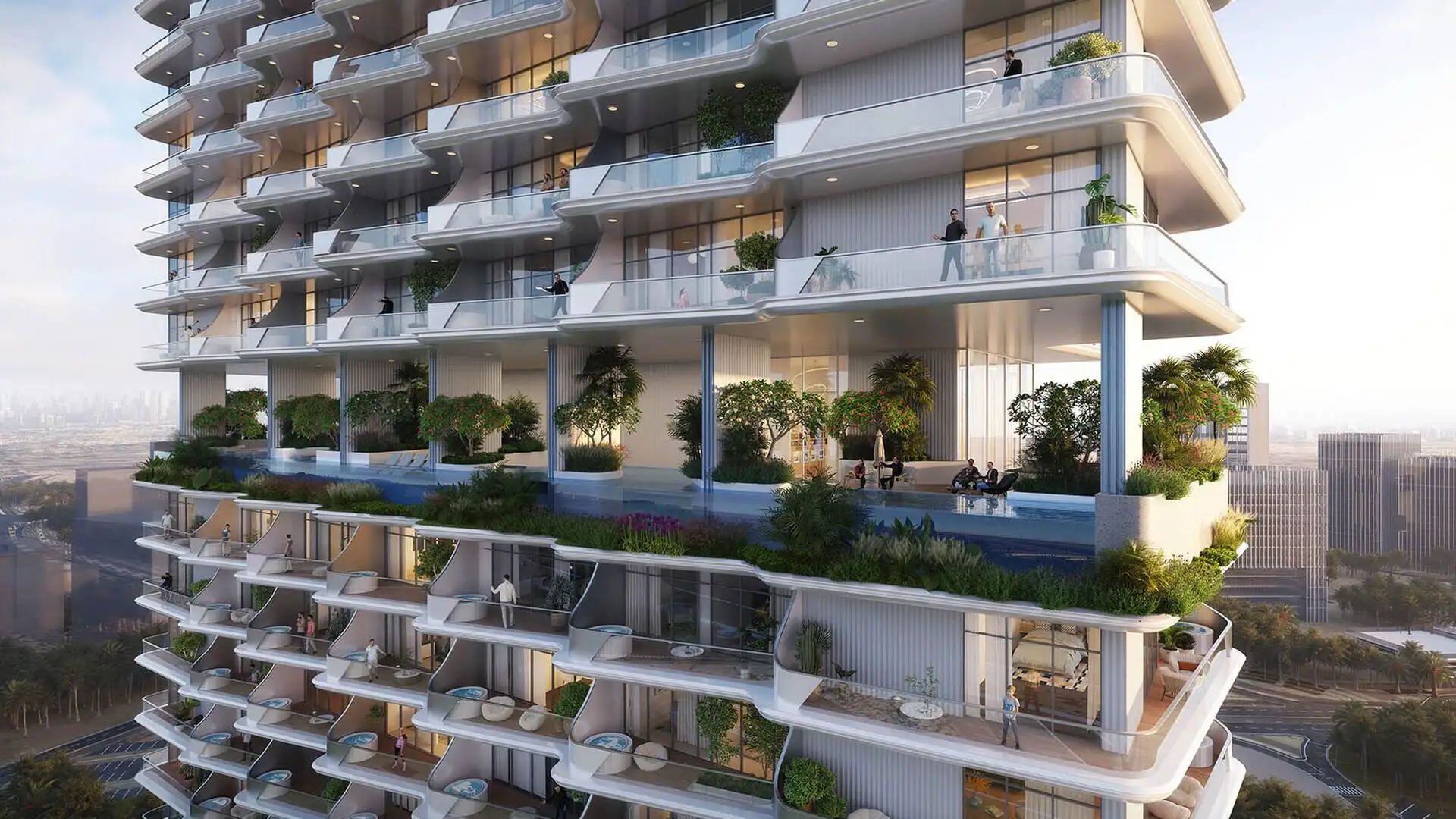 The development features studios and 1–3 bedroom residences with views of the city skyline