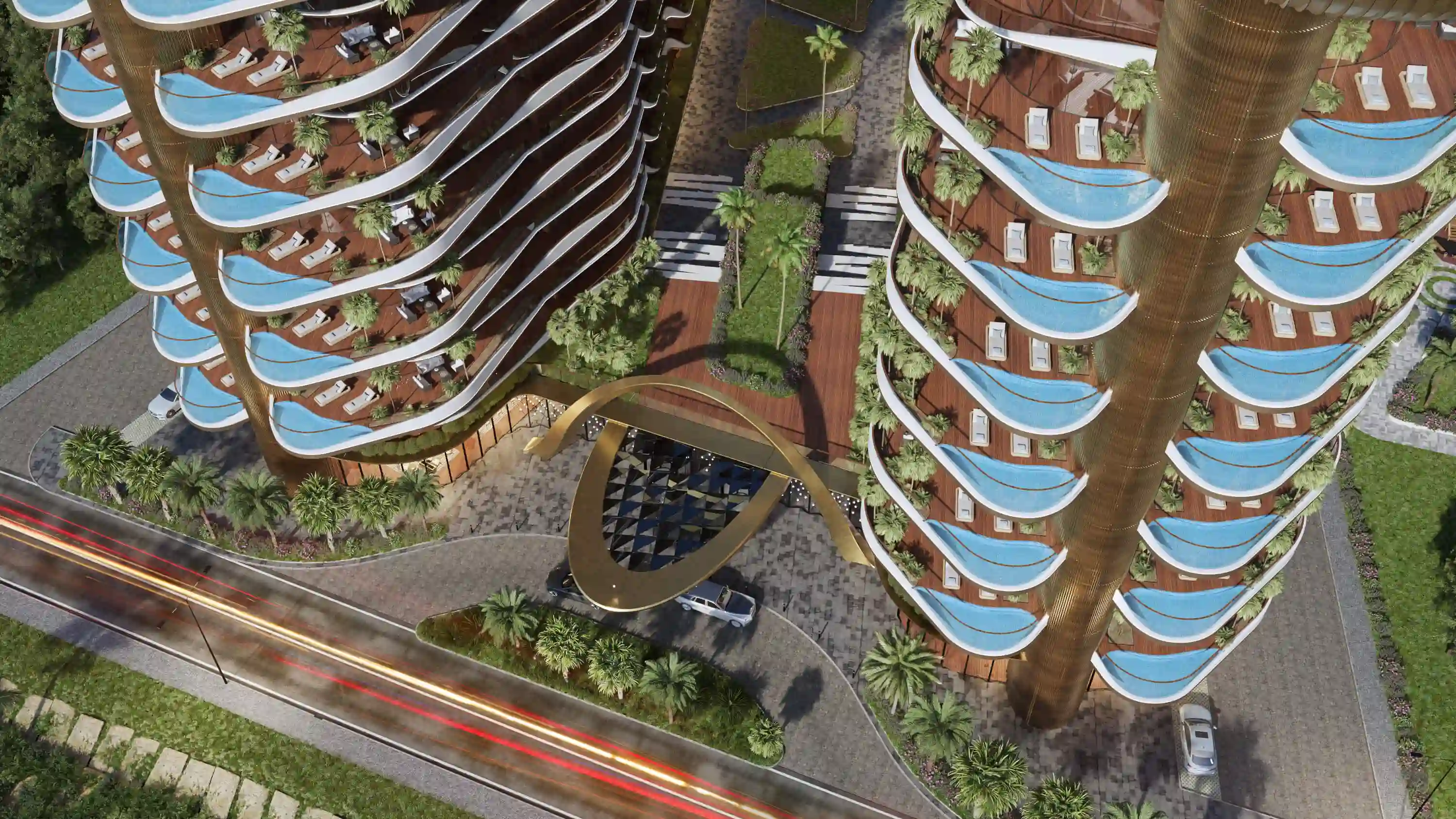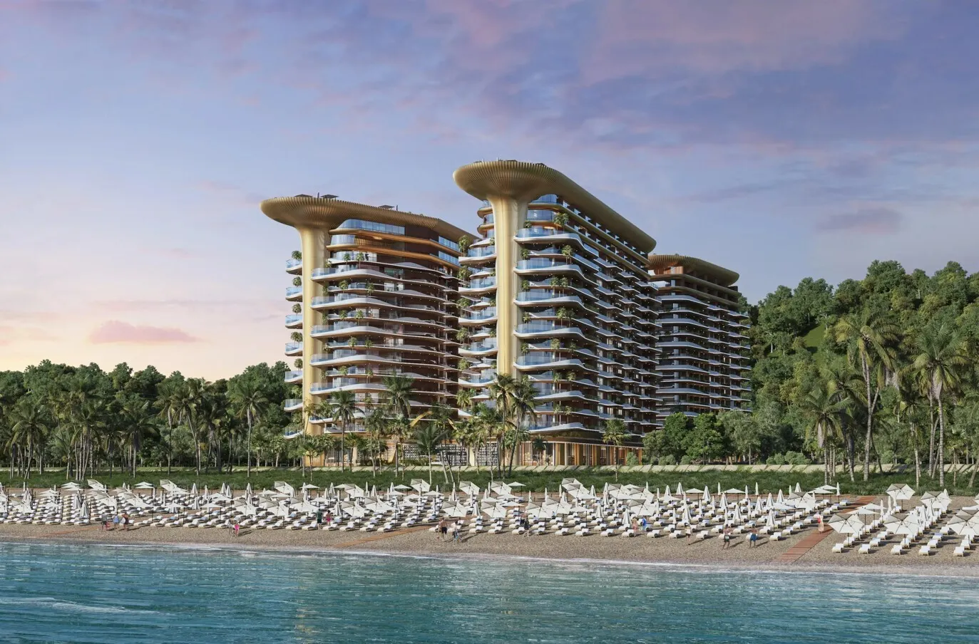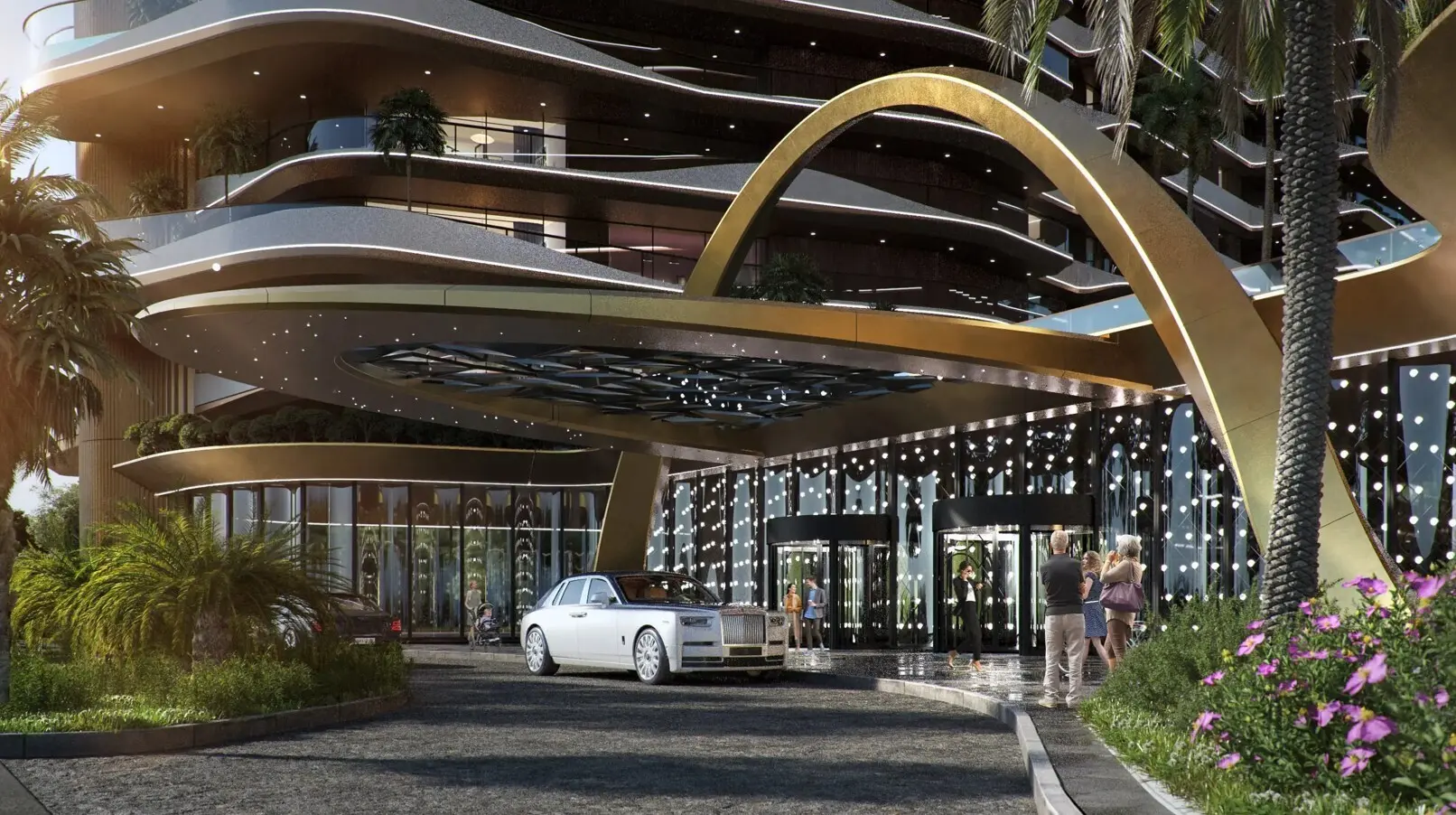 Panoramic windows, open balconies with glass railings, and nighttime façade lighting emphasize the project’s unique design