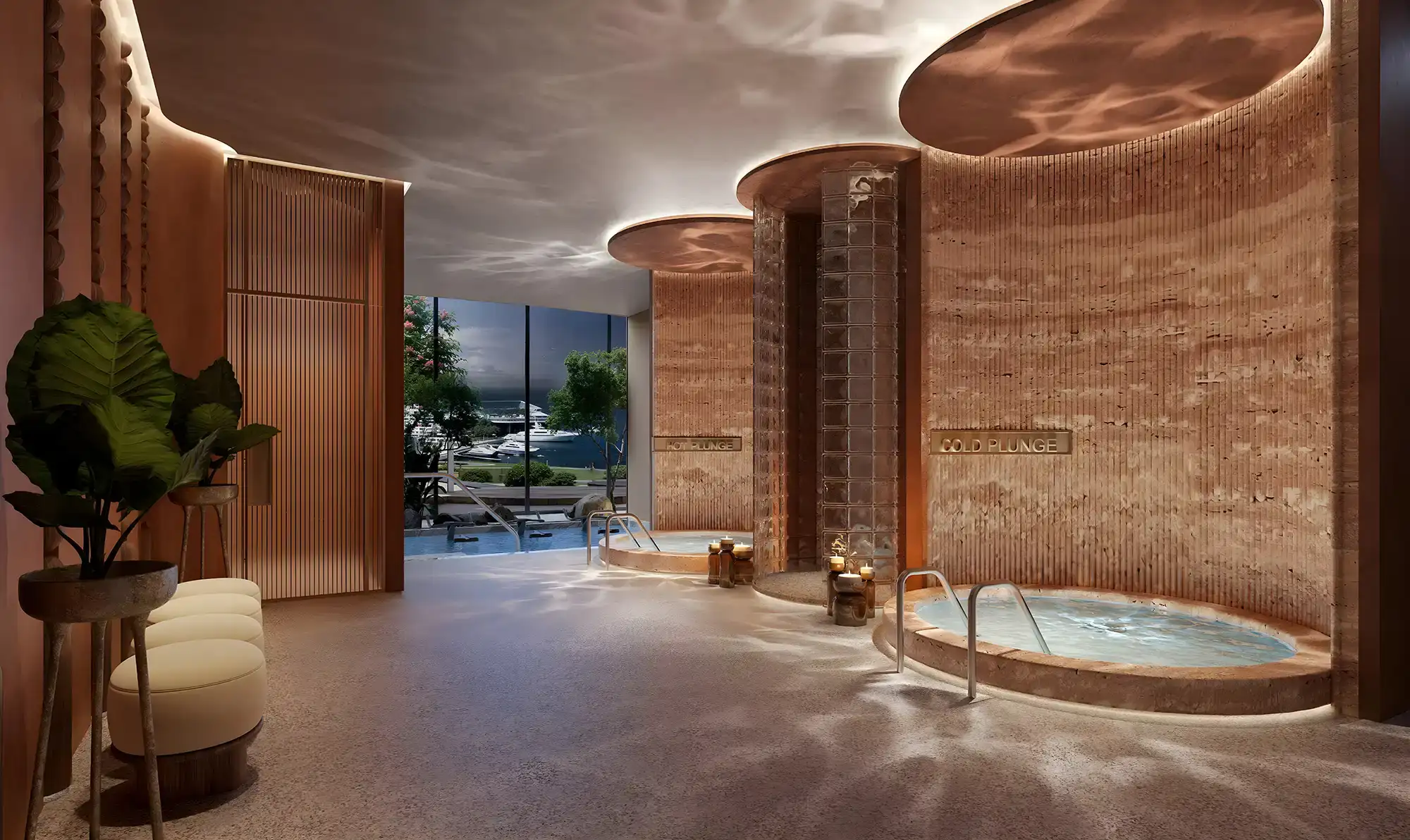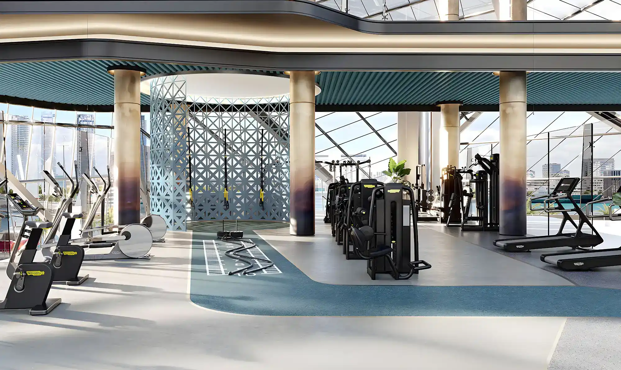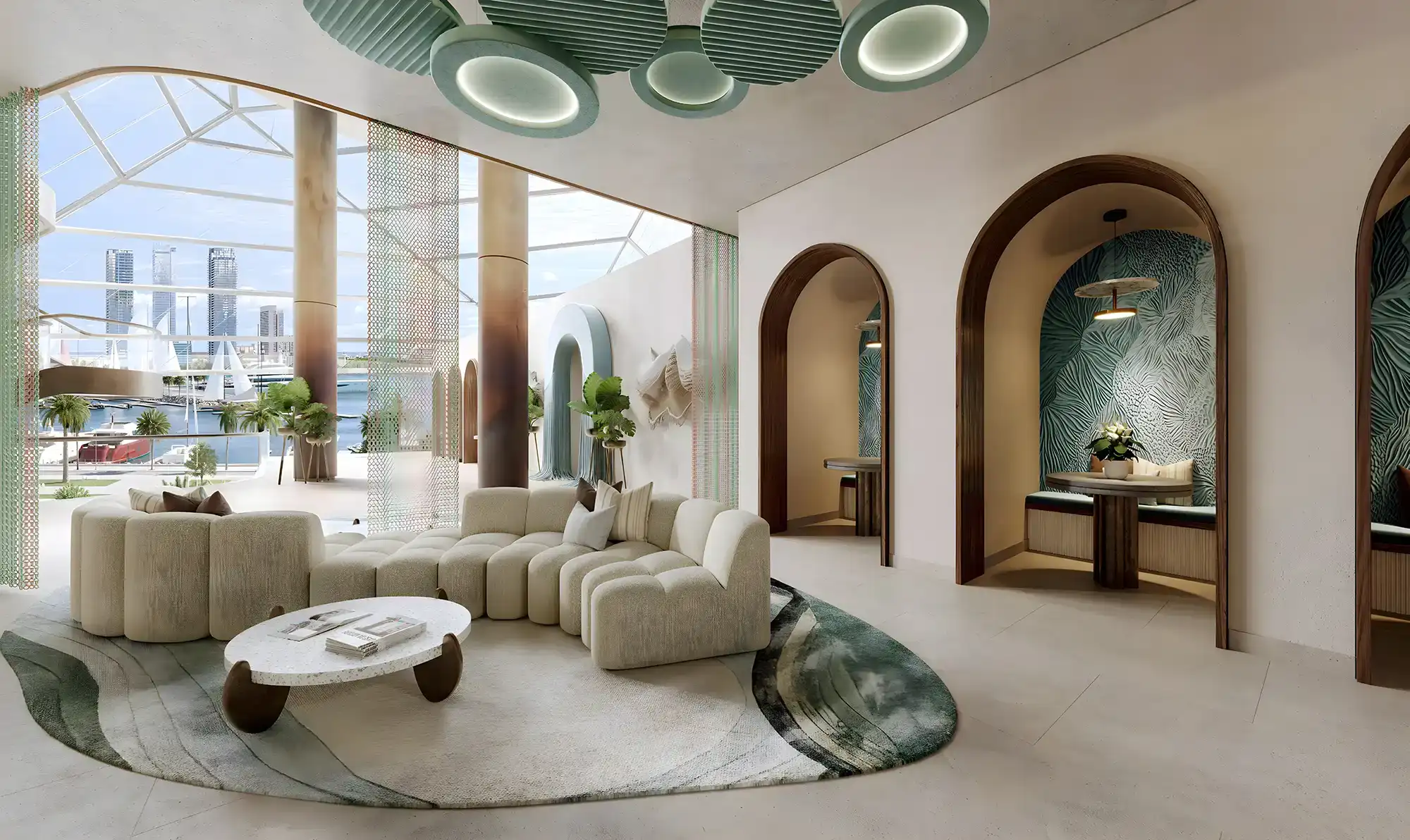 Floor-to-ceiling glass offers panoramic views of the bay, the marina, the city skyline and green areas