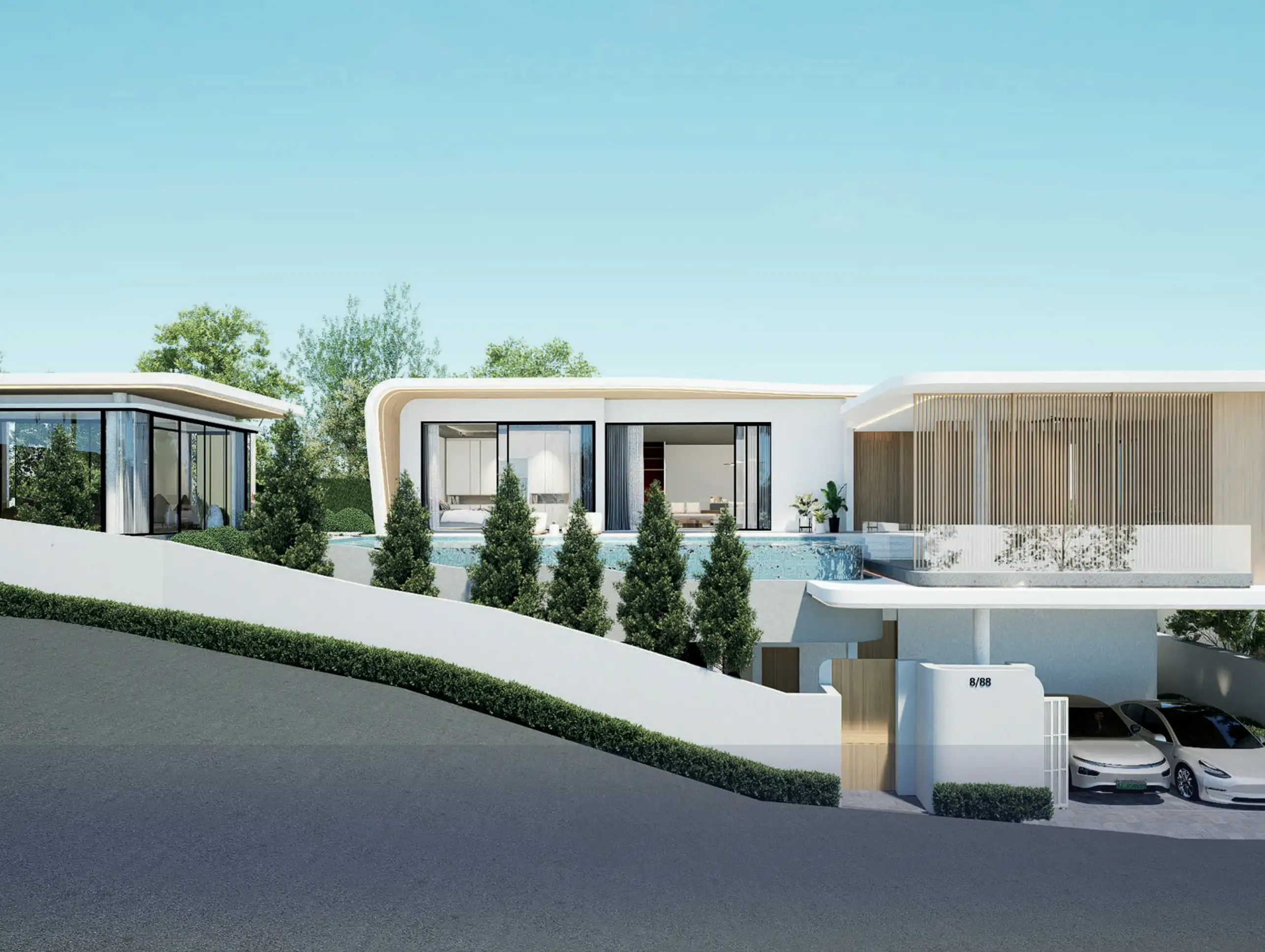 Each villa is equipped with a private pool and personal parking for 2–3 cars