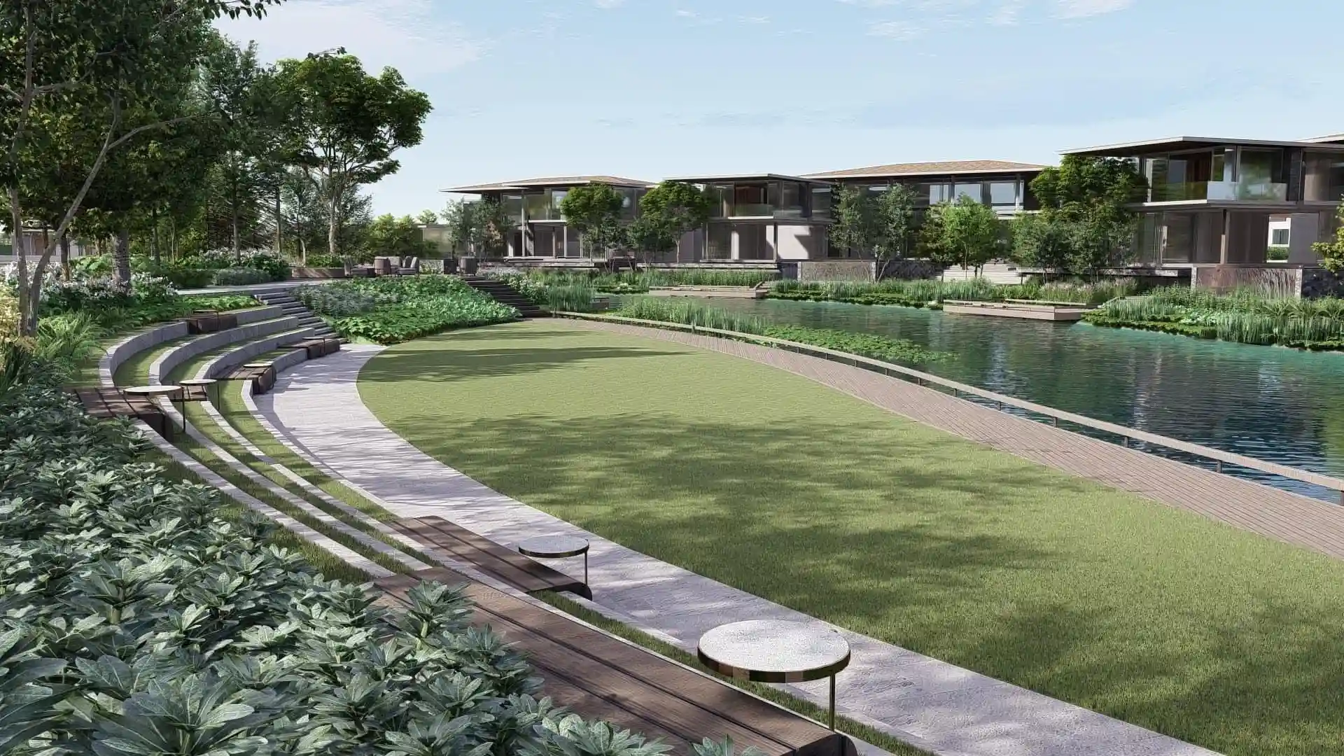 Three-bedroom villas are on plots of 382 m², four-bedroom villas on plots from 420 to 817 m², and five-bedroom residences on plots from 1,053 to 1,870 m²