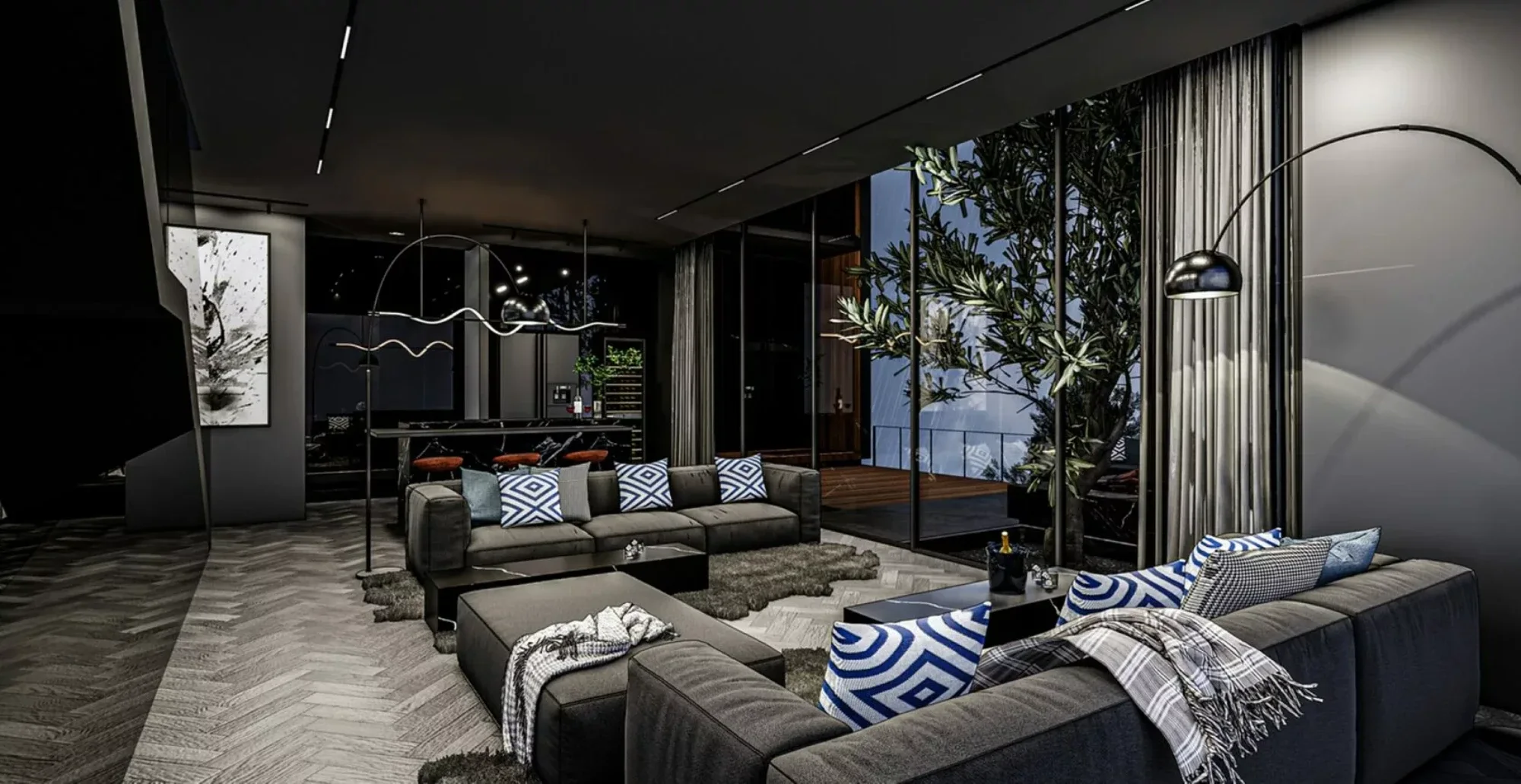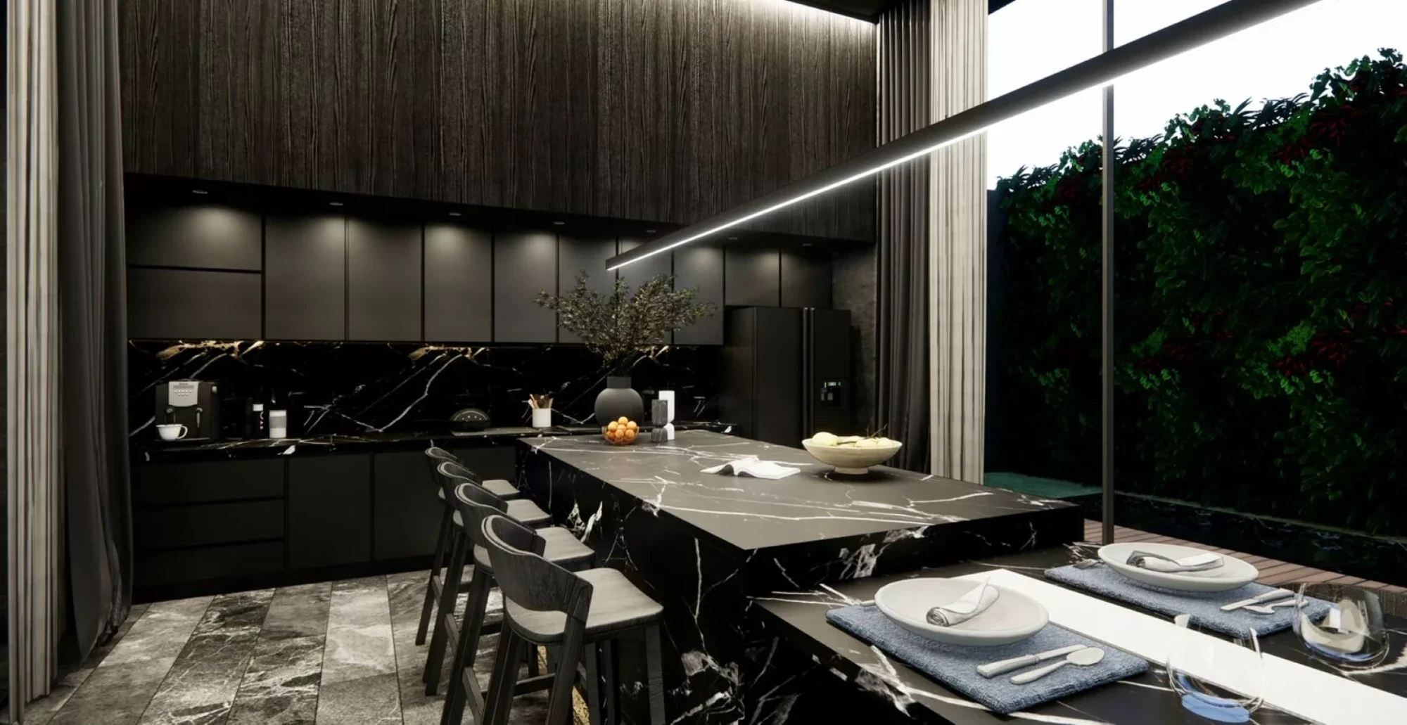 Each villa includes a Western-style kitchen with a bar counter and a dining area