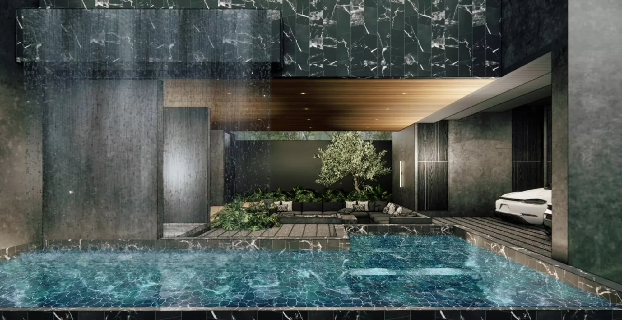 Each villa comprises two separate buildings with a private swimming pool and a terrace located between them on the second floor