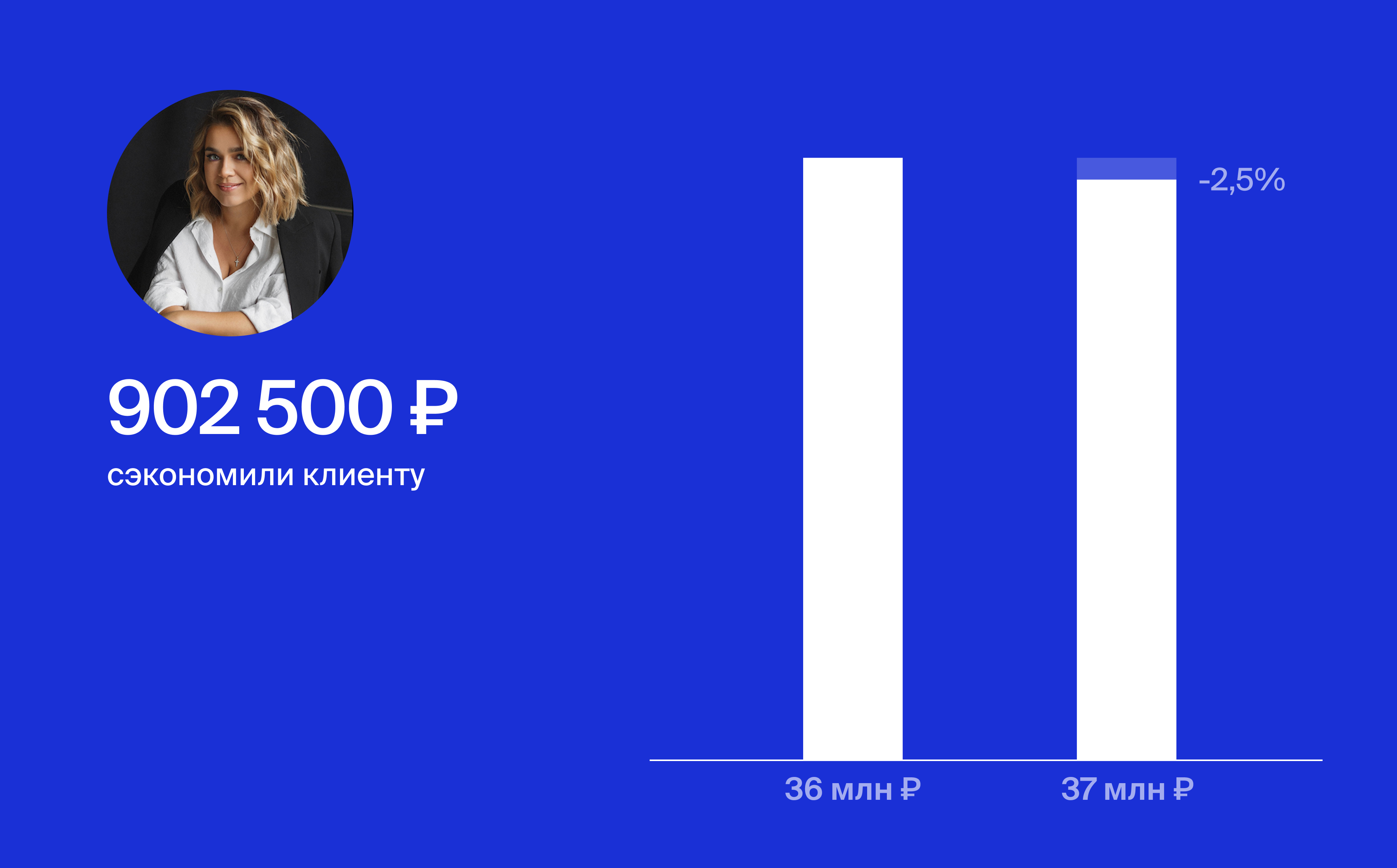 Ксения обратилась в Neginski, чтобы купить квартиру в ипотеку. Банк одобрил кредит в ЖК «Роттердам» с субсидией и увеличенным лимитом на 36,1 млн рублей. Но в день сделки сообщили, что за пониженную ставку надо доплатить 2,5%. Аналитик Neginski договорился с застройщиком напрямую и получил скидку, равную сумме доплаты. В итоге клиентка сэкономила 902 500 рублей.