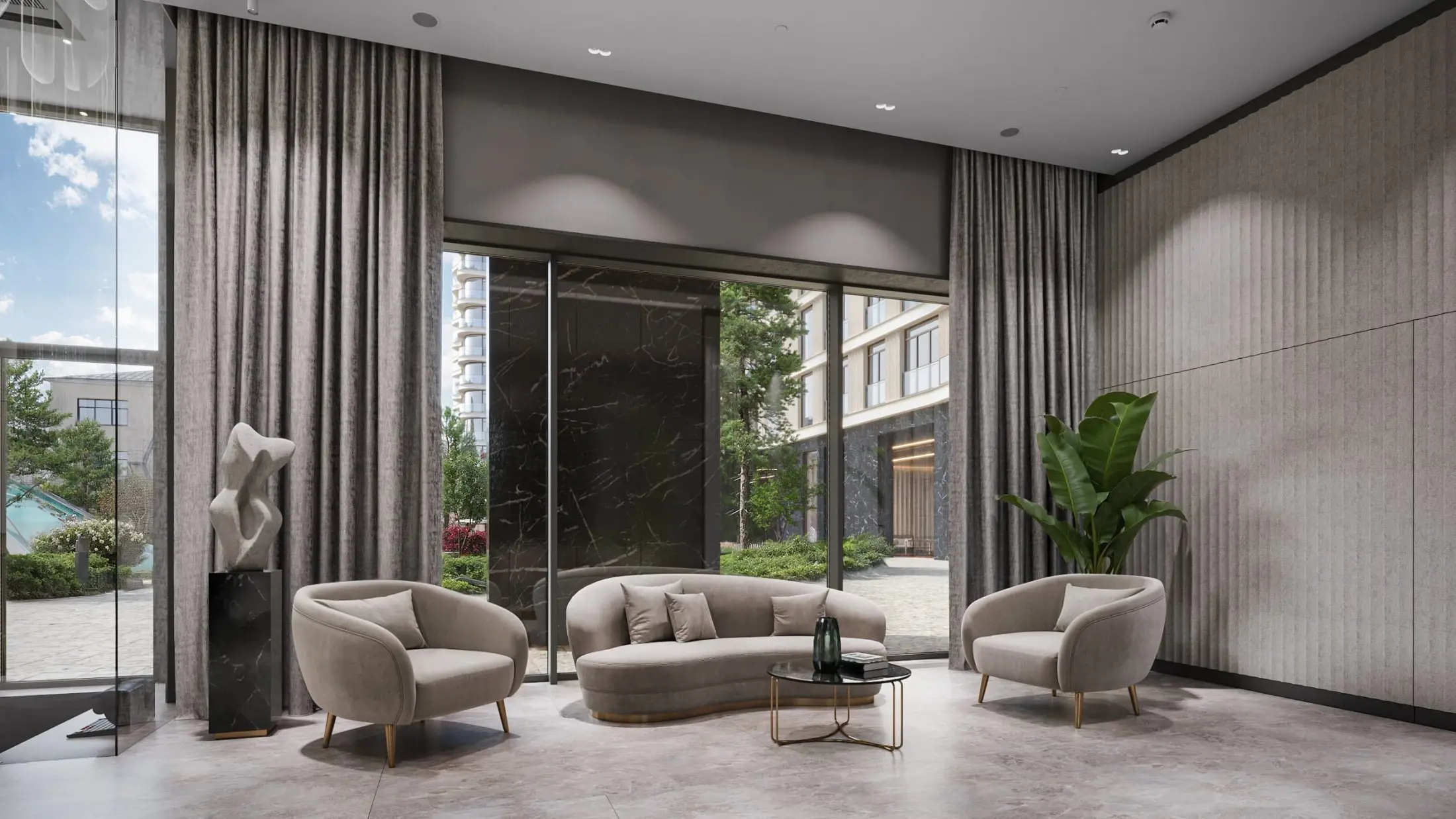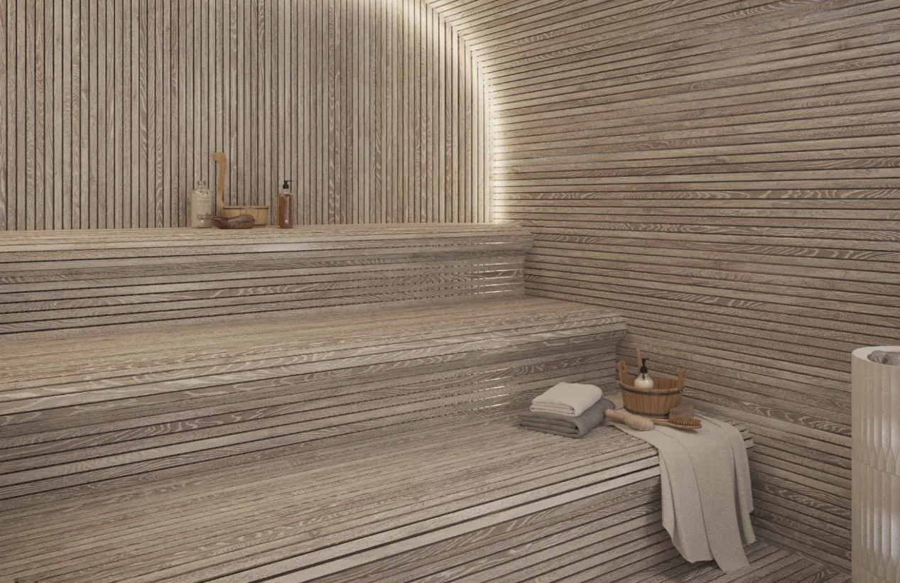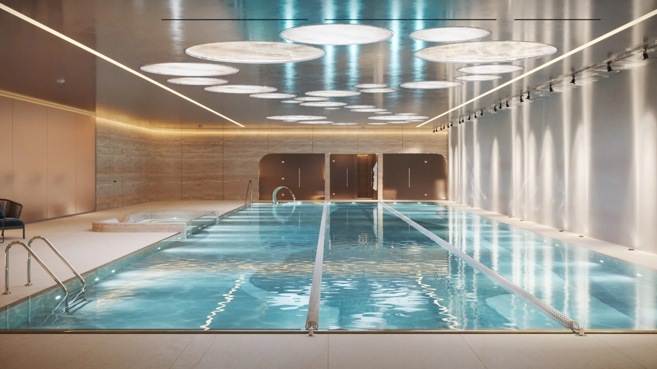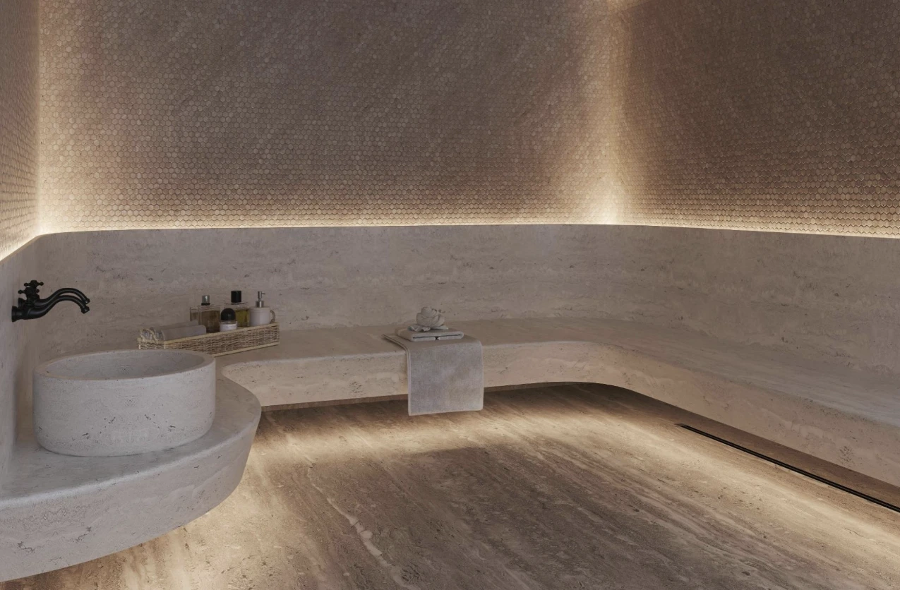 На отдельном участке территории дома расположены шесть вилл площадью от 133 до 660 м², при каждой из которых — уютное патио с собственной территорией и в подземном пространстве — личная зона спа с бассейном