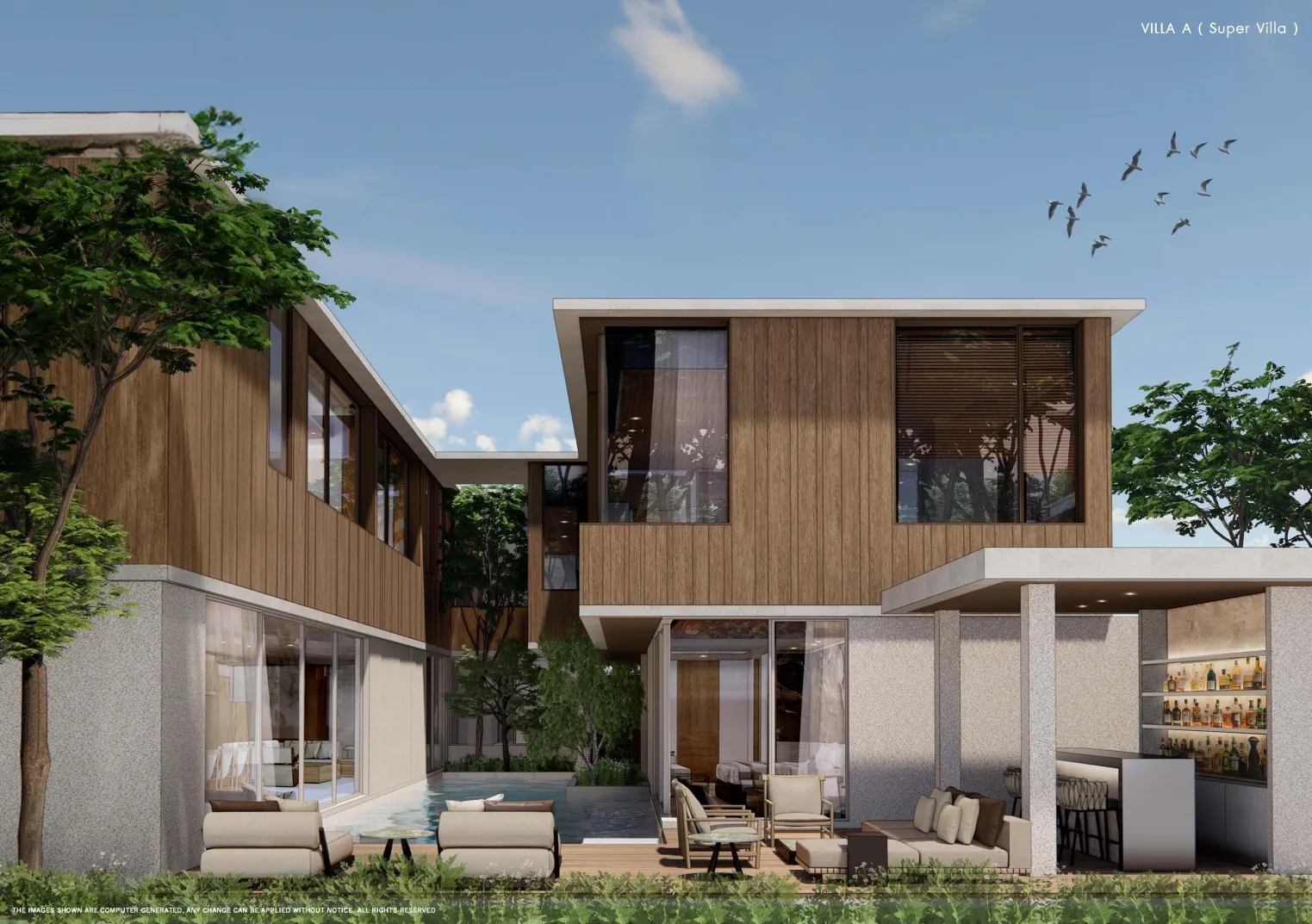 Виллы включают в себя просторные гостиные и обеденные зоны, частные бассейны и открытые террасы. Открытая планировка интерьеров обеспечивает плавные переходы между пространствами, что делает их подходящими как для отдыха, так и для развлечений.