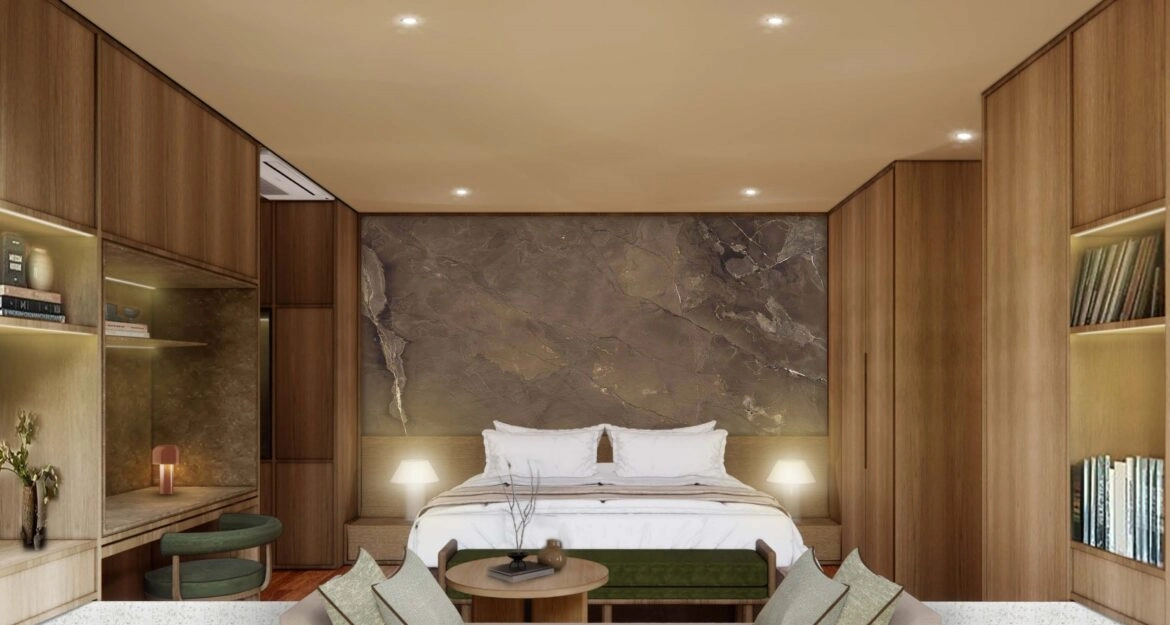 Каждая вилла продумана до мелочей: натуральные напольные покрытия подчеркивают стабильность, а контрастные элементы текстиля и декора добавляют динамики.