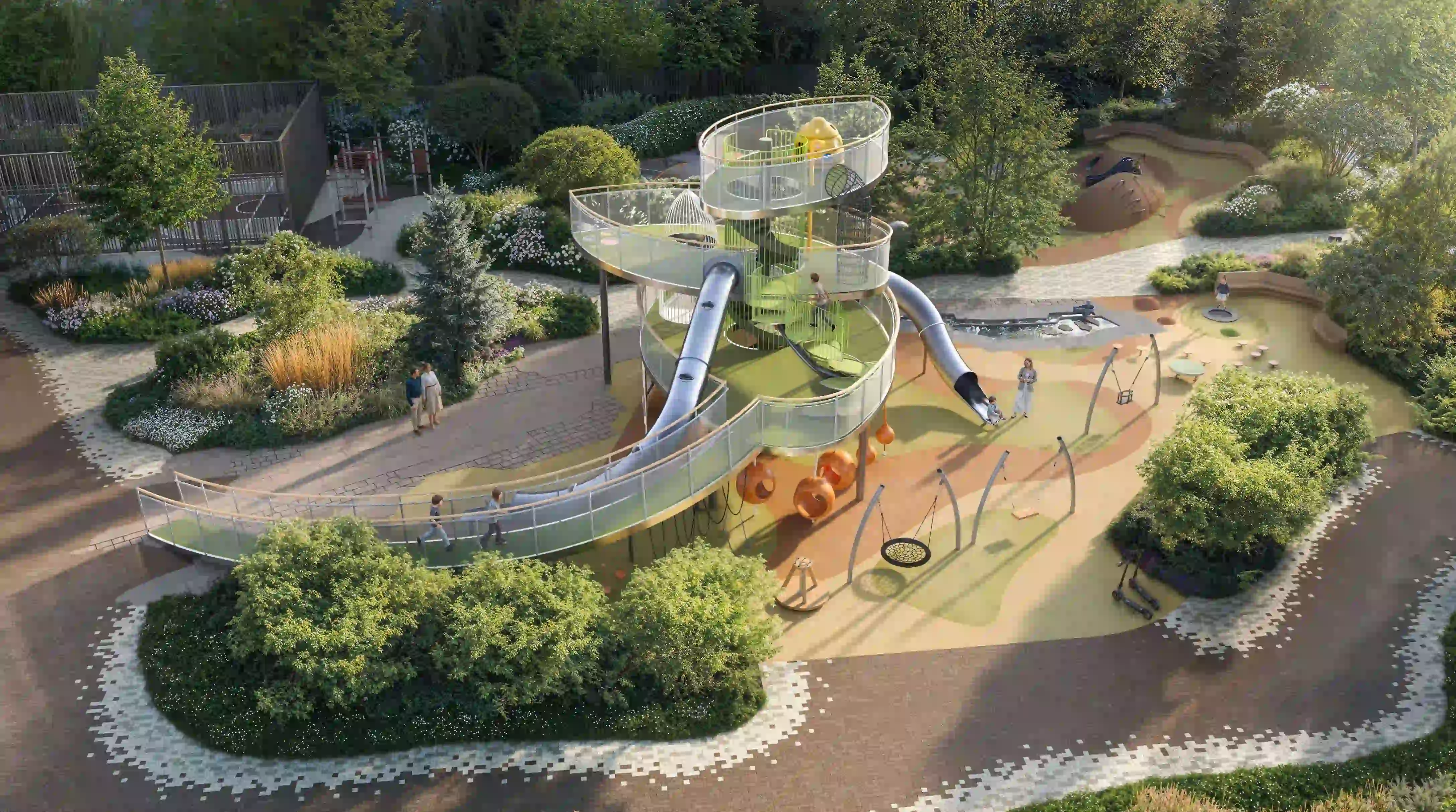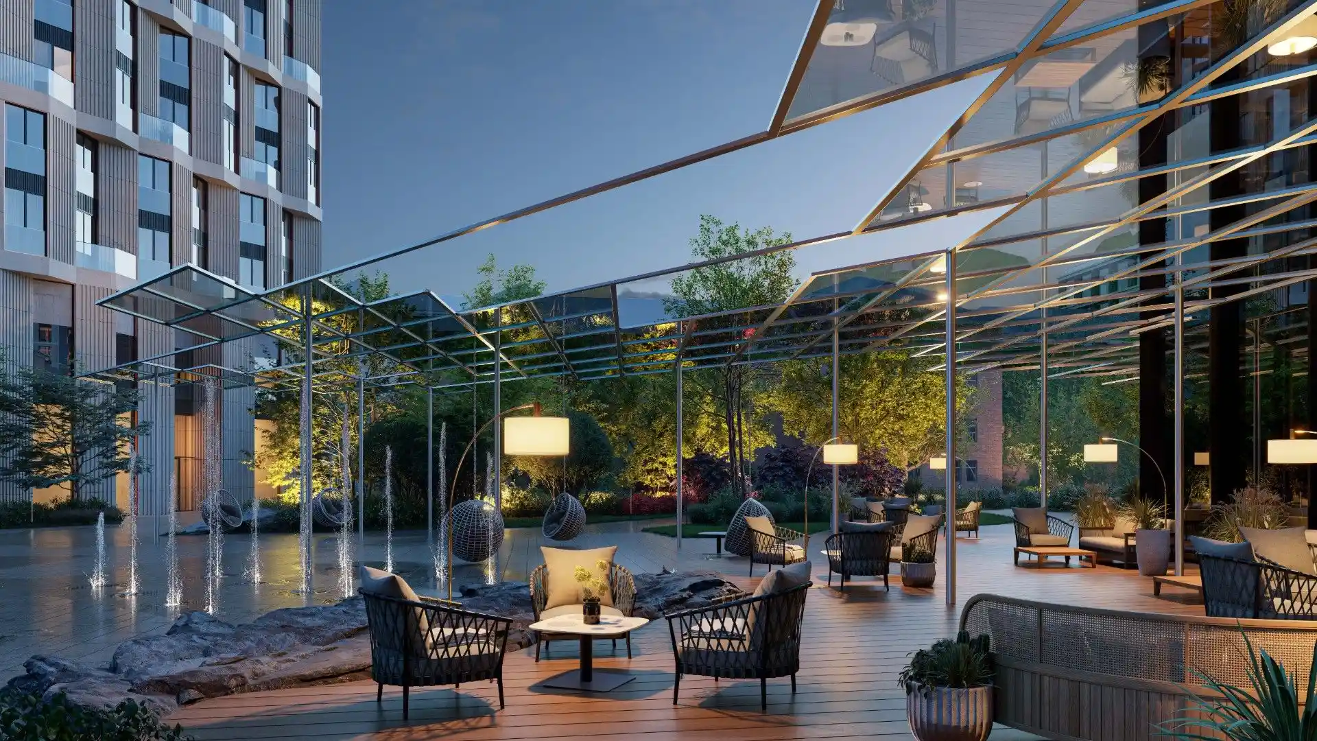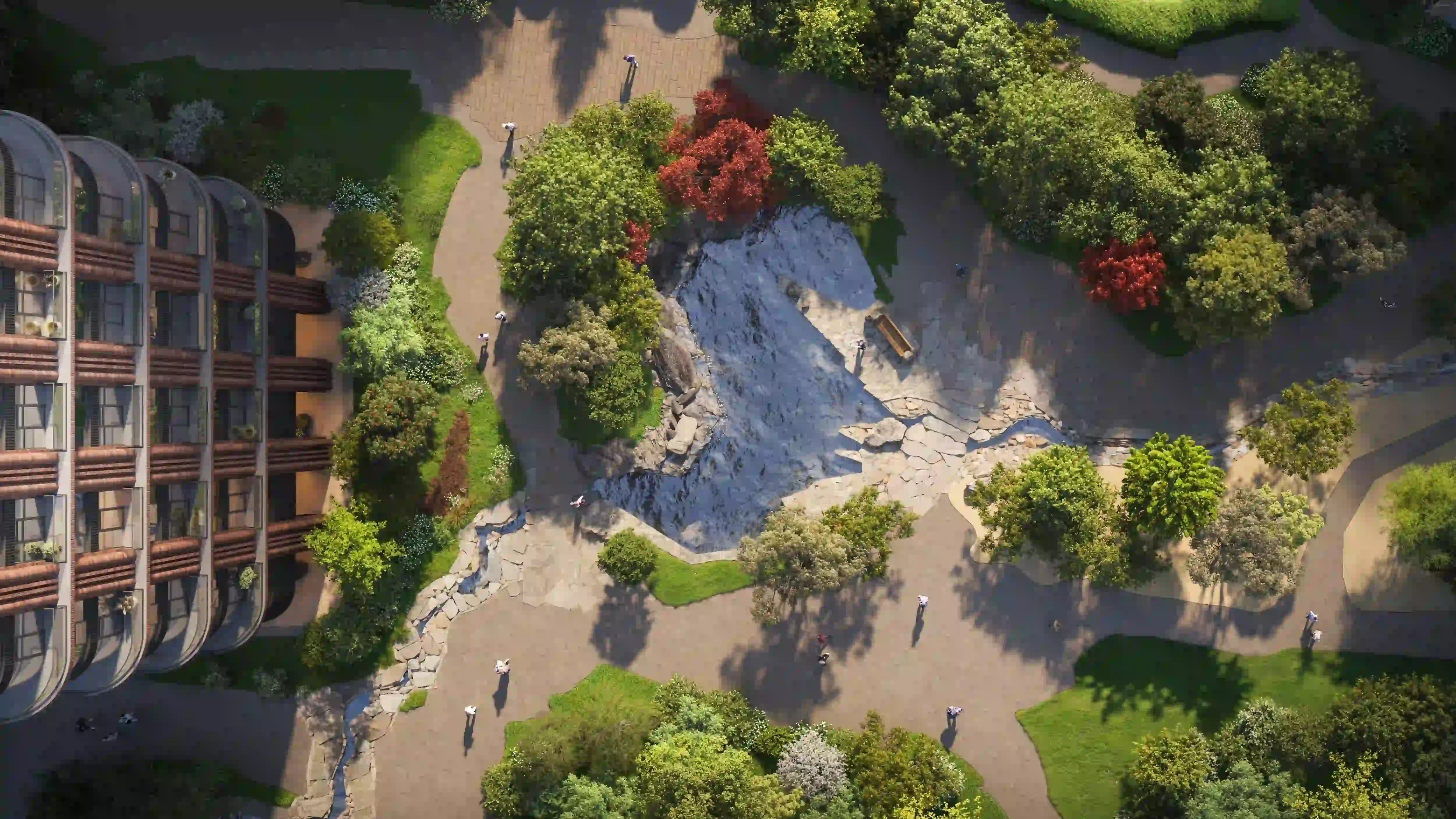 На территории квартала обустроен приватный двор-парк площадью 1,9 гектара, занимающий 70% всей площади проекта. Уникальный прогулочный бульвар, доступный только для резидентов и их гостей, соединяет разнообразные зоны отдыха и декоративные водные элементы.