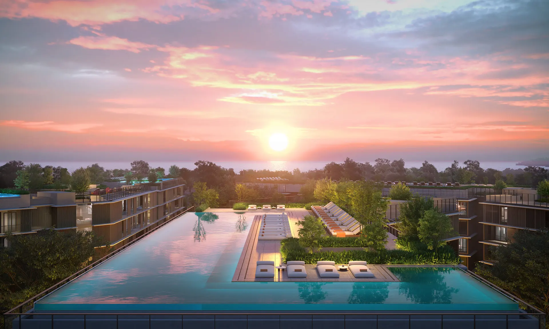 Большой инфинити бассейн для всех резидентов, занимающий 40% крыши в каждом здании