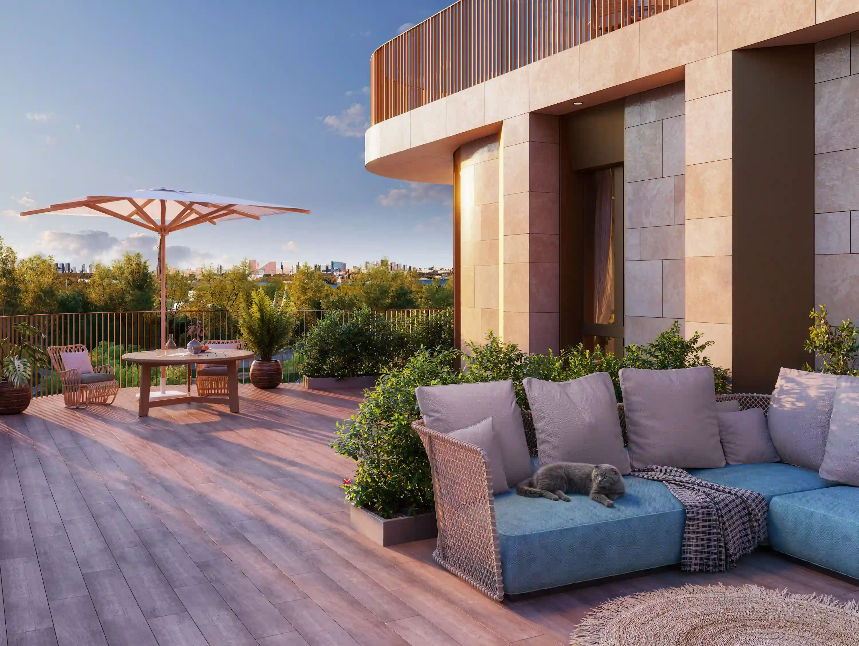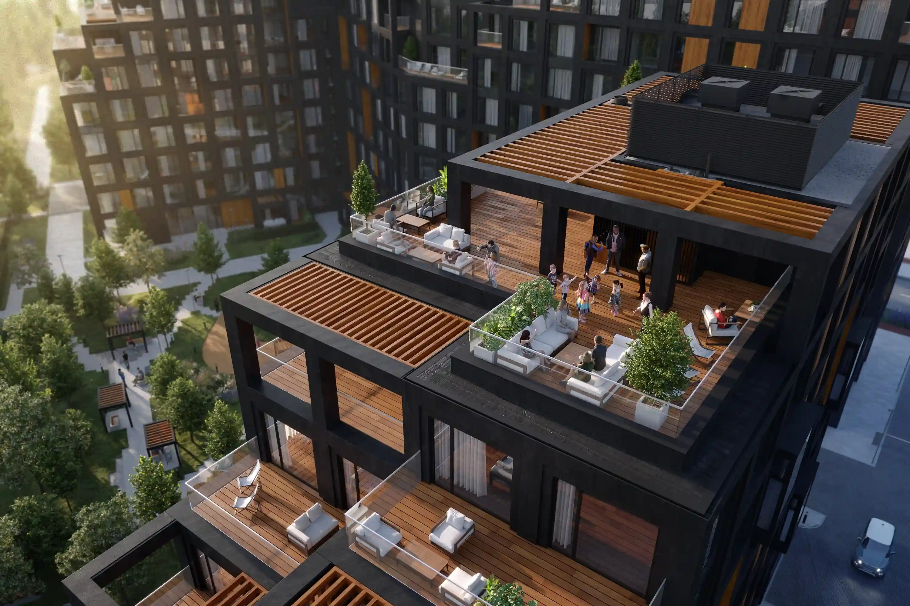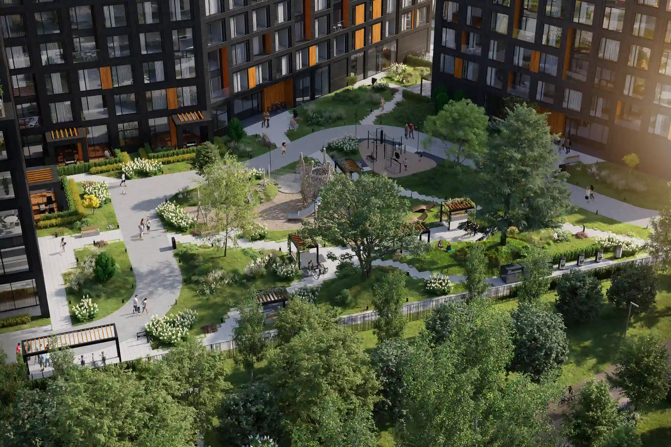 Помимо стандартных квартир, в ассортименте представлены апартаменты с частными террасами, а на первых этажах — несколько вариантов с террасой-садом