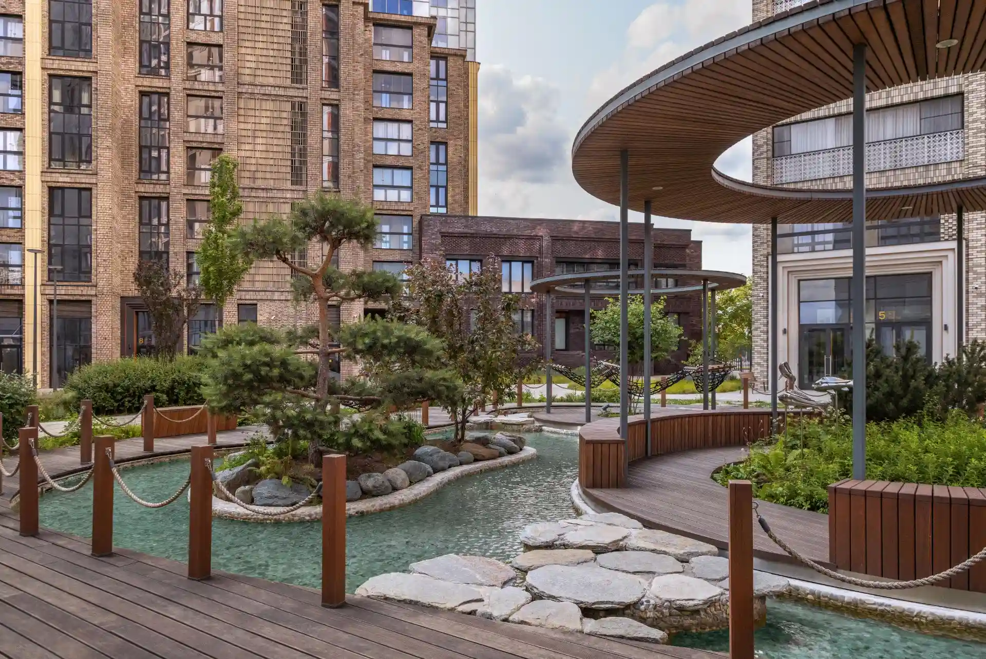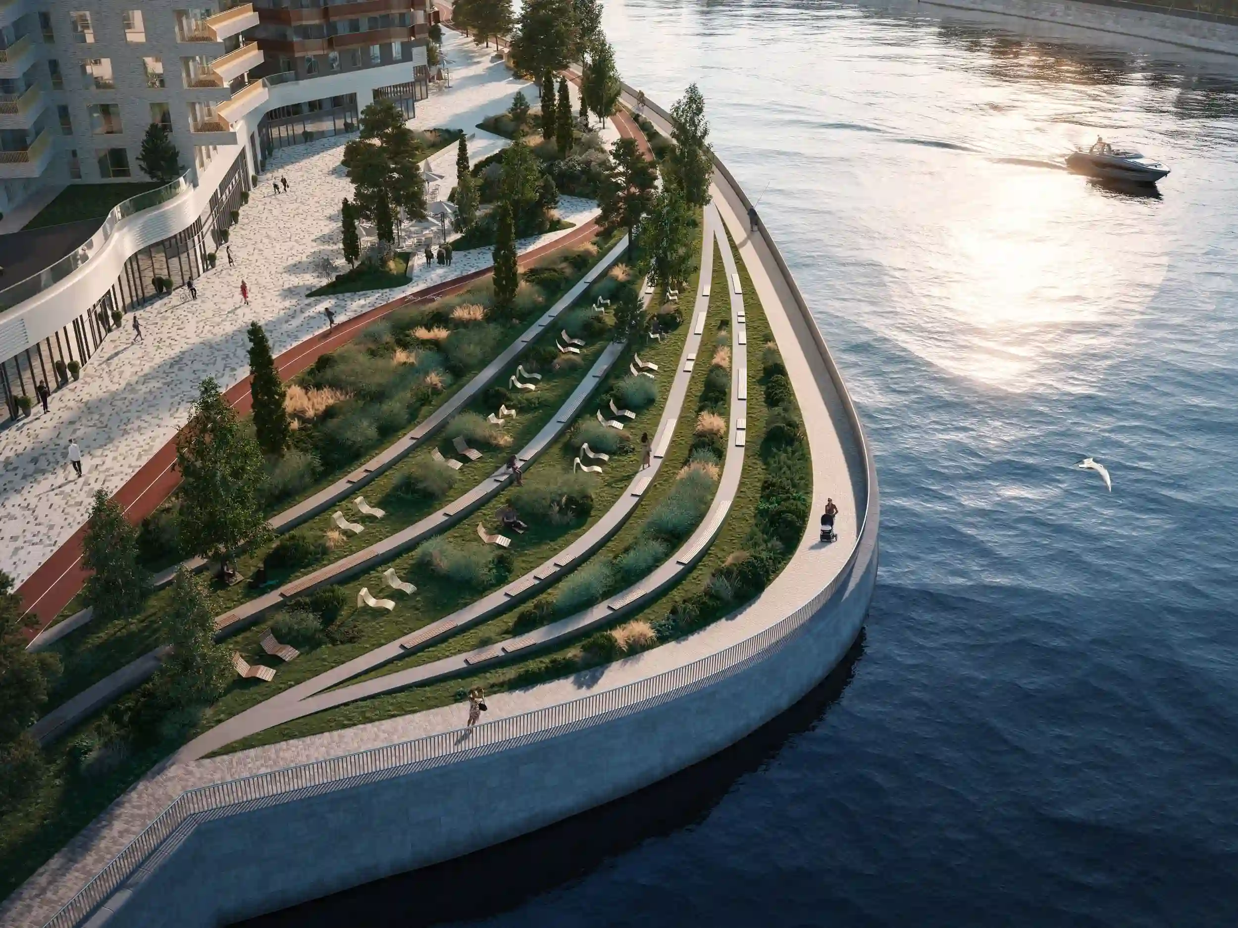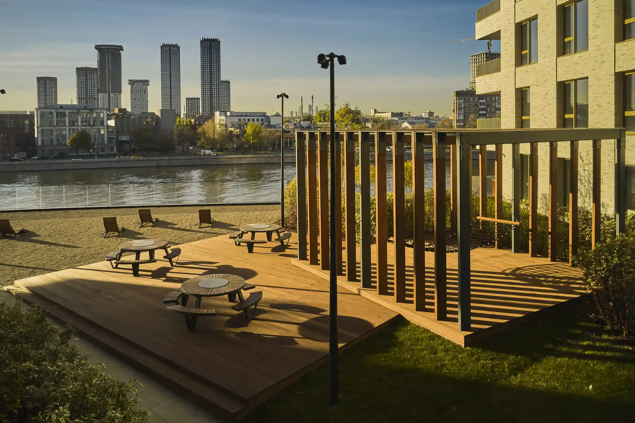 Дома расположены на пешеходной набережной протяженностью один километр, где отсутствует автомобильное движение, что обеспечивает чистый воздух и тишину. К воде оборудованы безопасные спуски. Отсутствие будущей застройки между кварталом и рекой гарантирует сохранение панорамных видов.