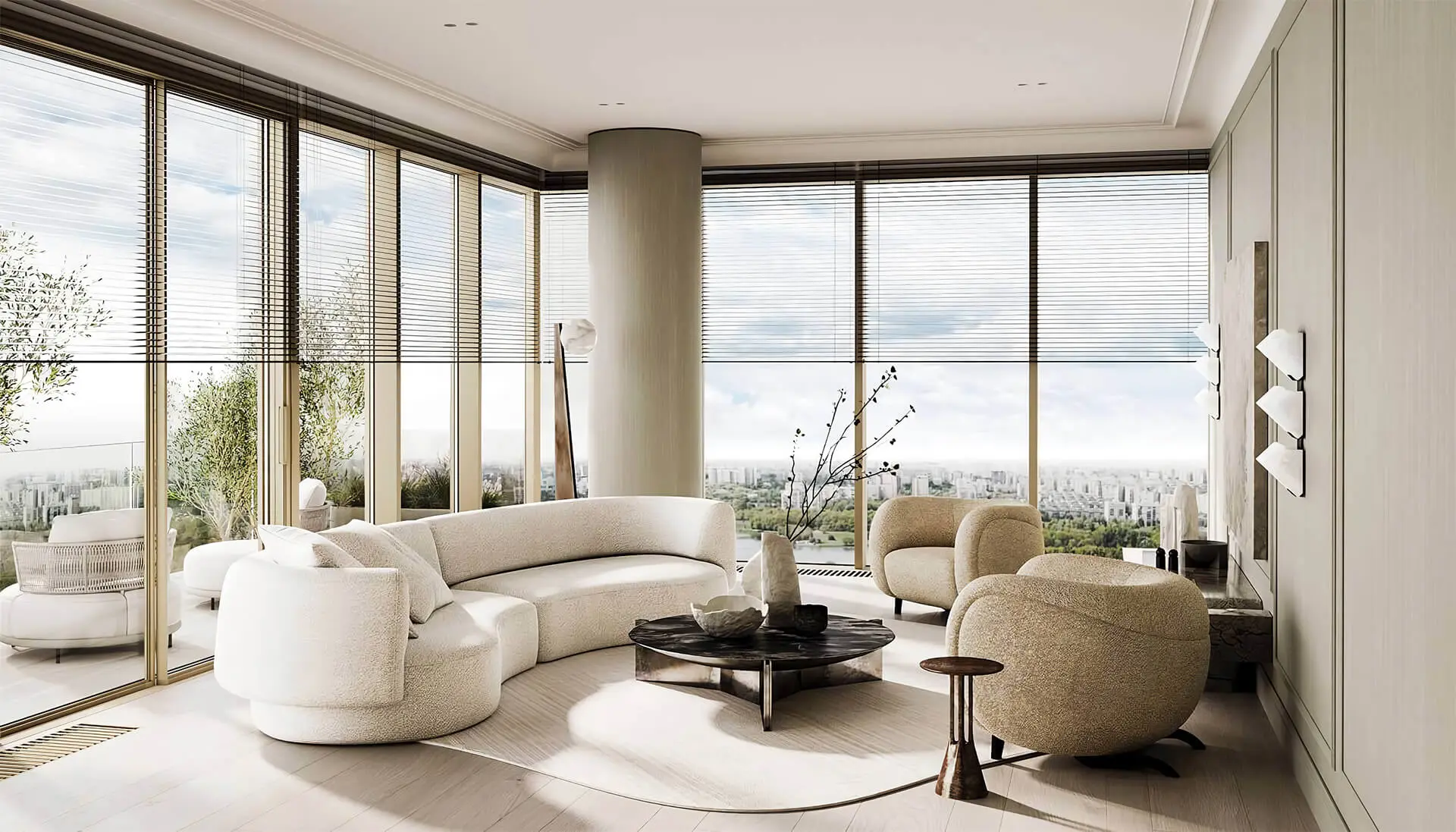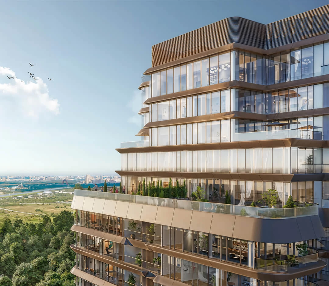 Особенностью комплекса является трансформируемое остекление балконов, которое можно адаптировать к сезону, складывая летом или оставляя закрытым зимой. Это решение позволяет жителям круглогодично использовать пространство с максимальным комфортом.