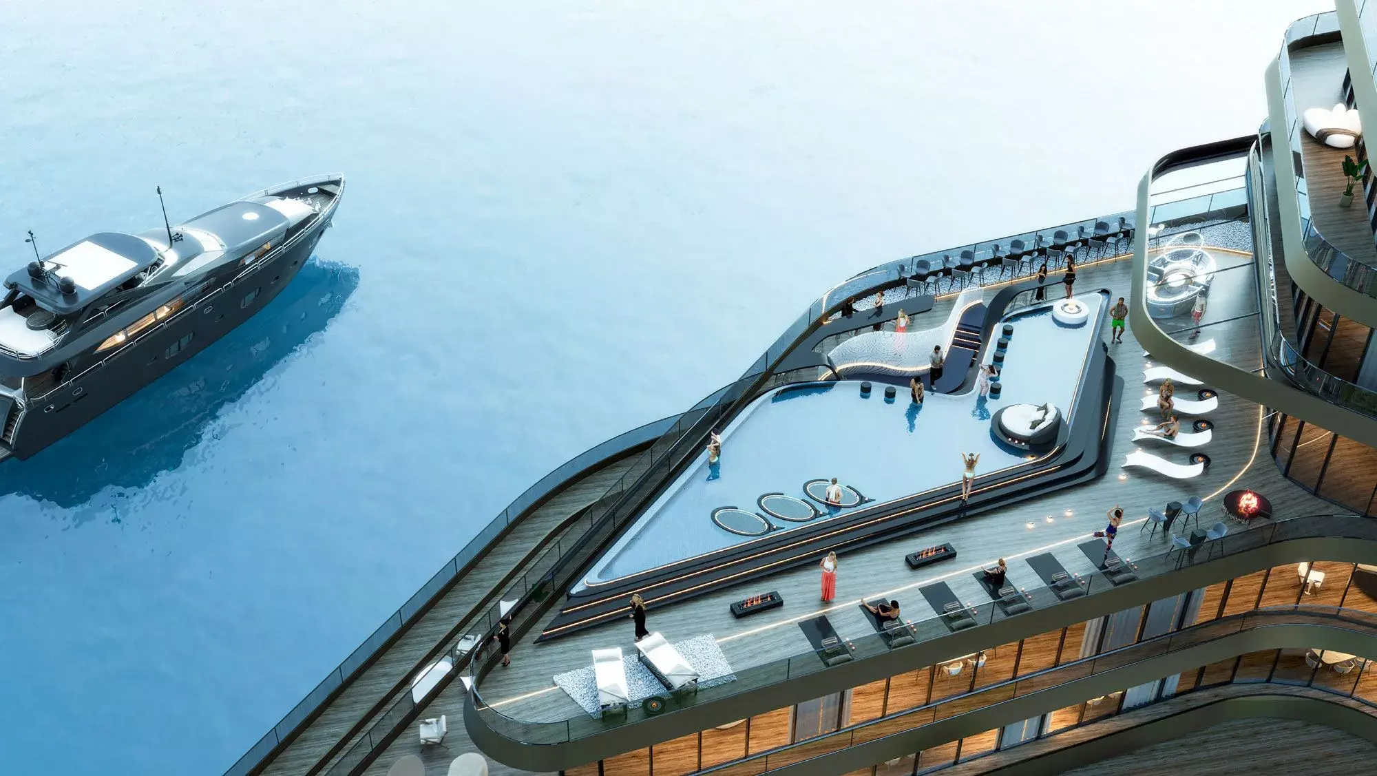 Состоит из четырех соединенных между собой высотных зданий в виде яхт