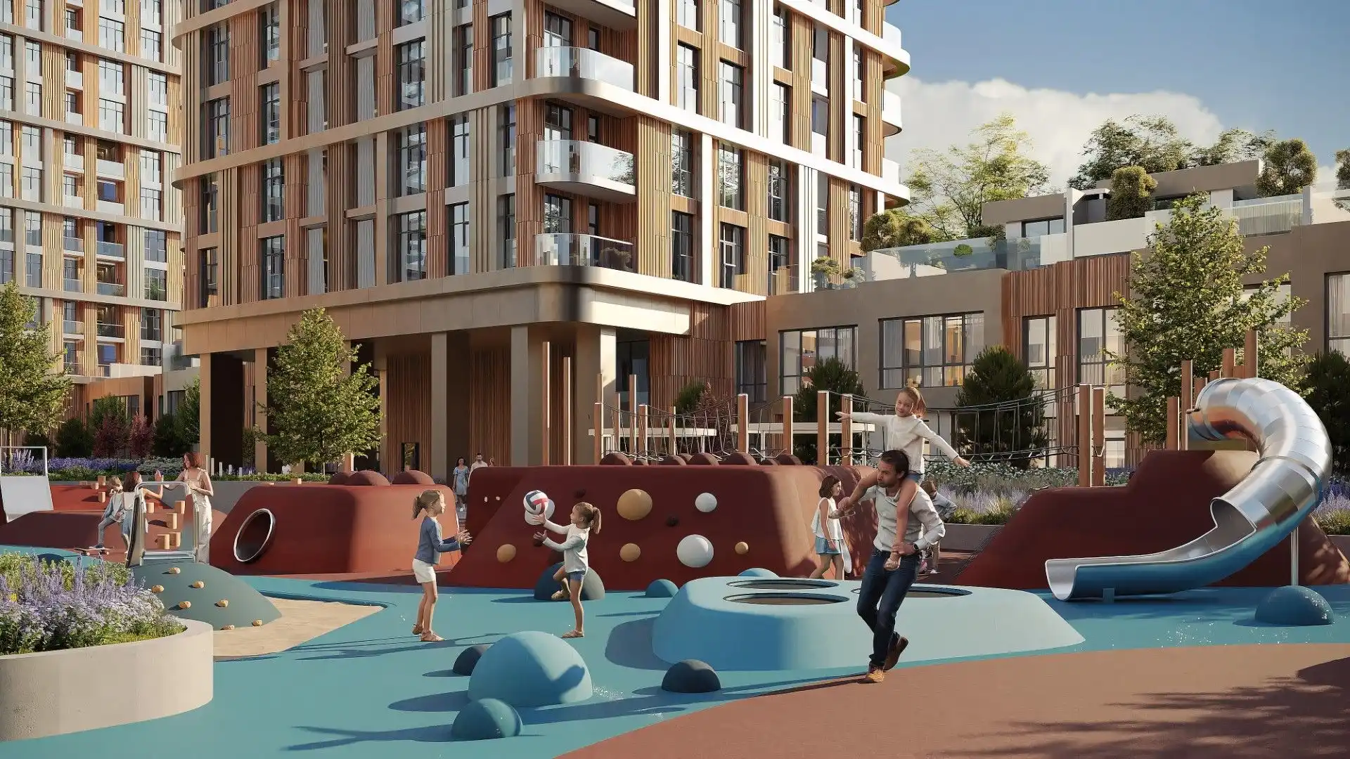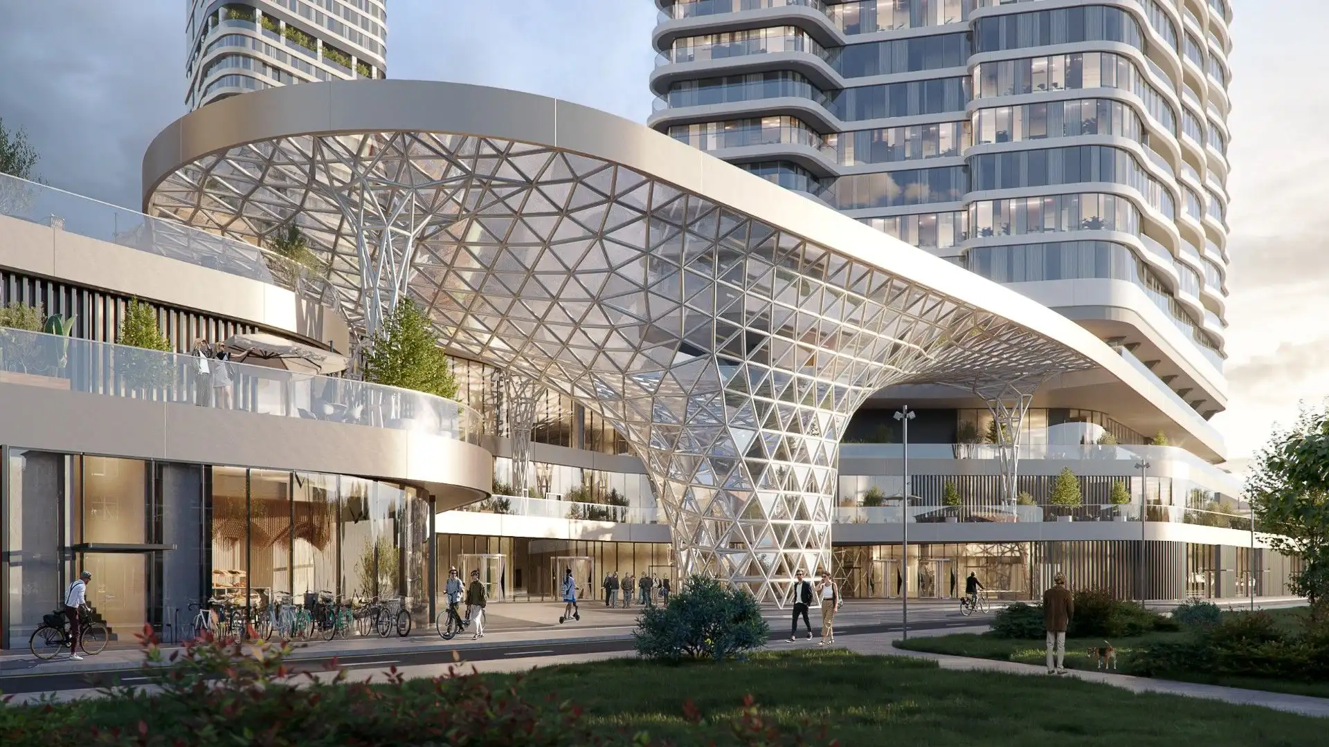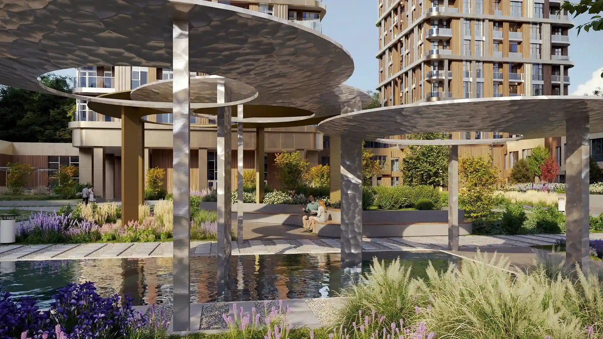 Внутренний двор-парк комплекса занимает 9000 м², а его благоустройство концептуально связано с близостью к реке.