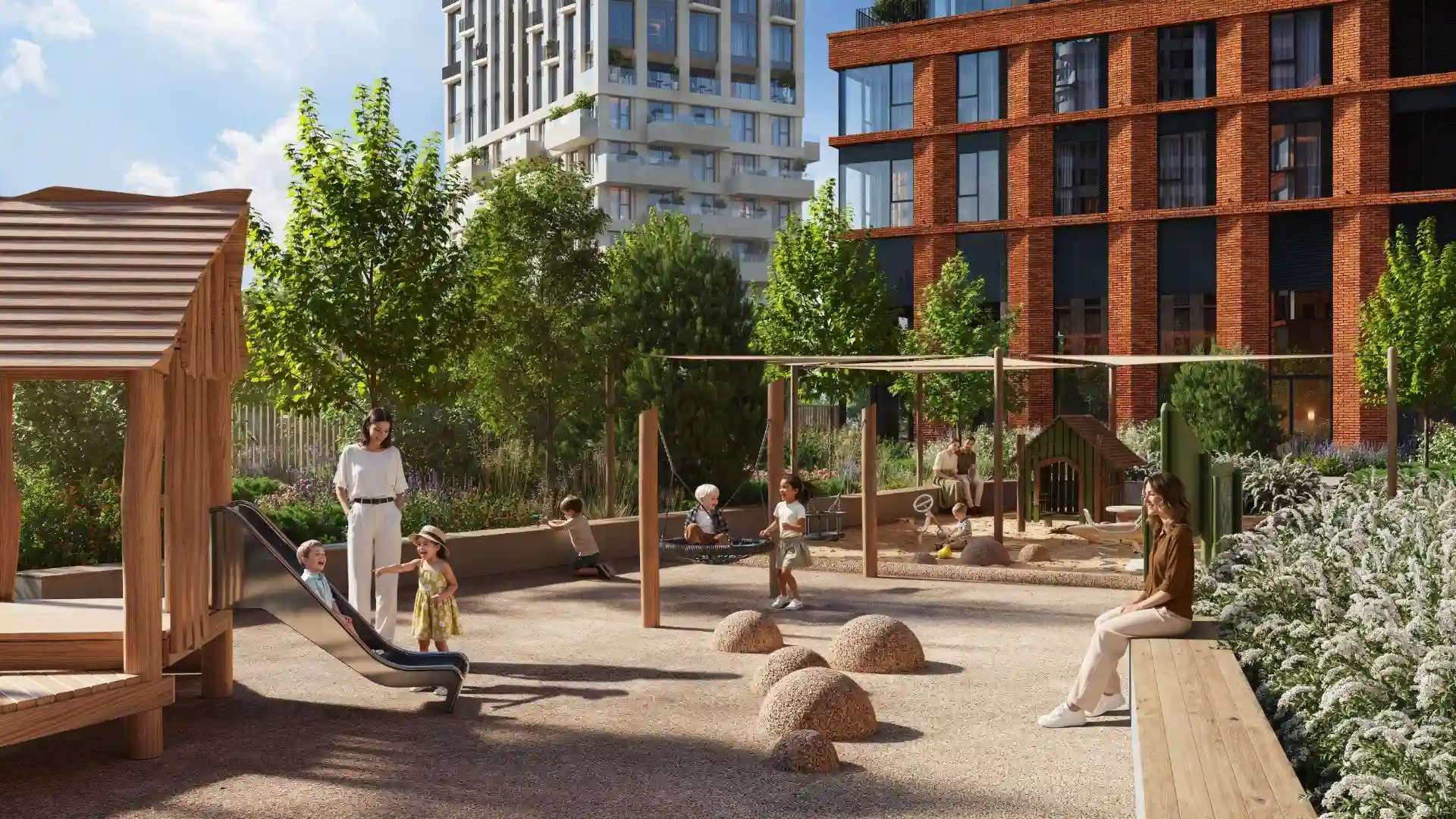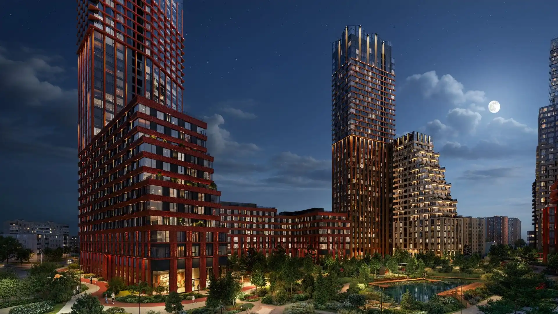 Жилой квартал включает частный парк площадью три гектара с хвойными деревьями и собственным прудом. Прогулочные аллеи парка плавно переходят в благоустроенные дворы.