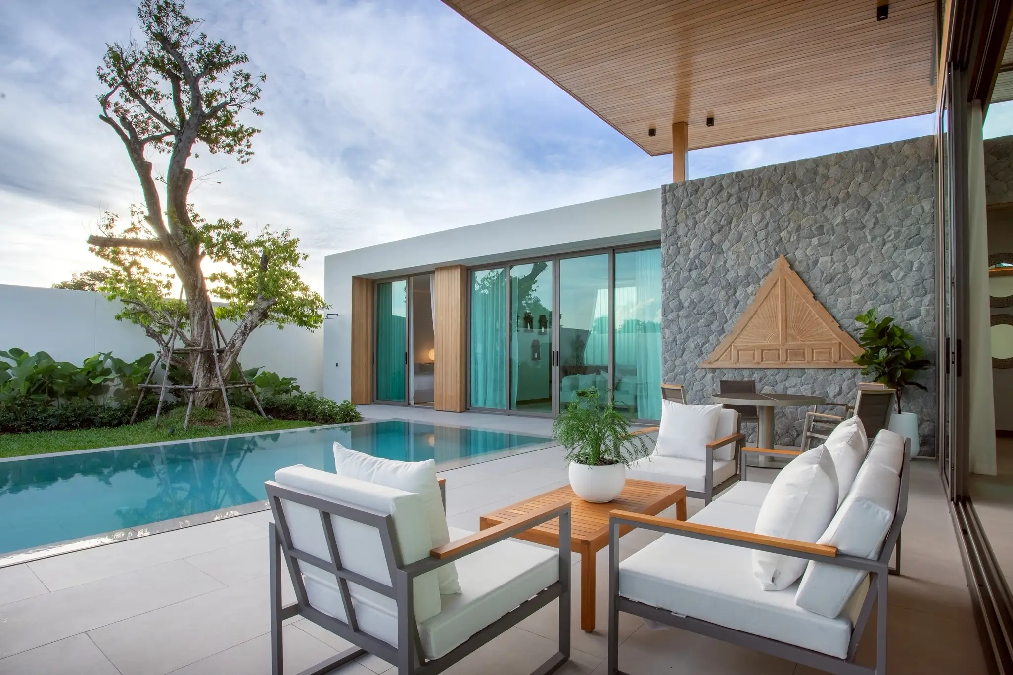 Здание L-образной формы вокруг частного бассейна обеспечивает прямой выход на террасу у бассейна из большинства частей виллы, включая главную спальню, гостиную и некоторые гостевые спальни