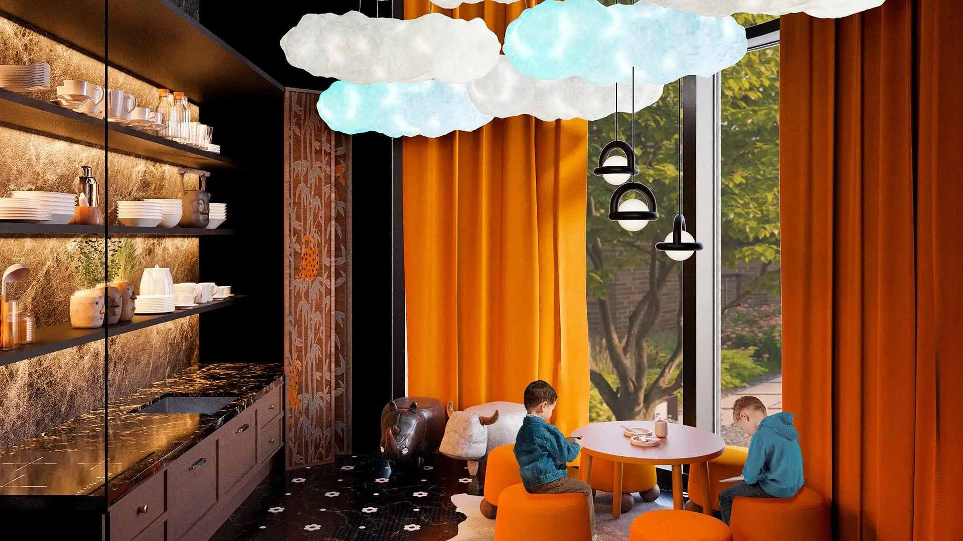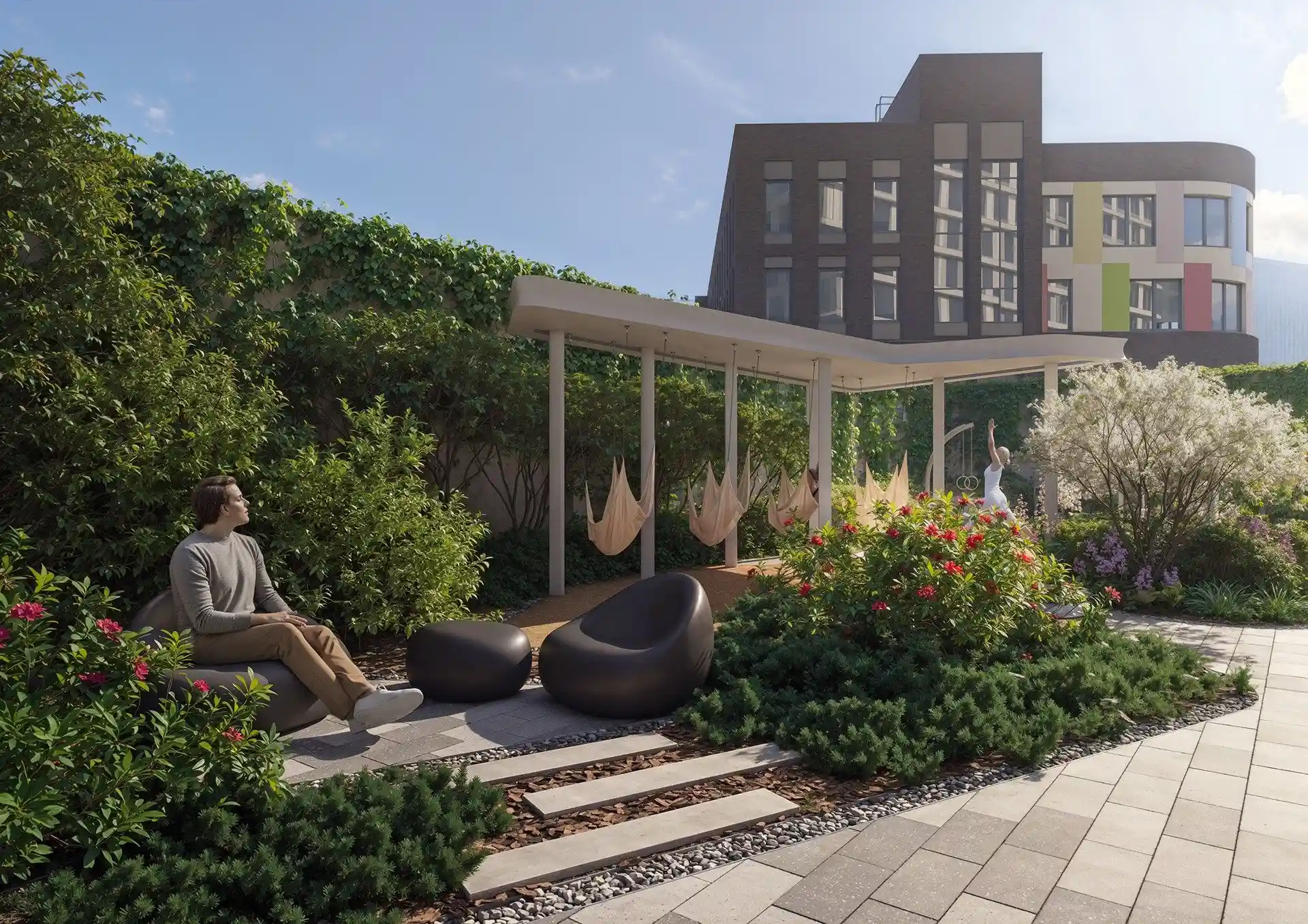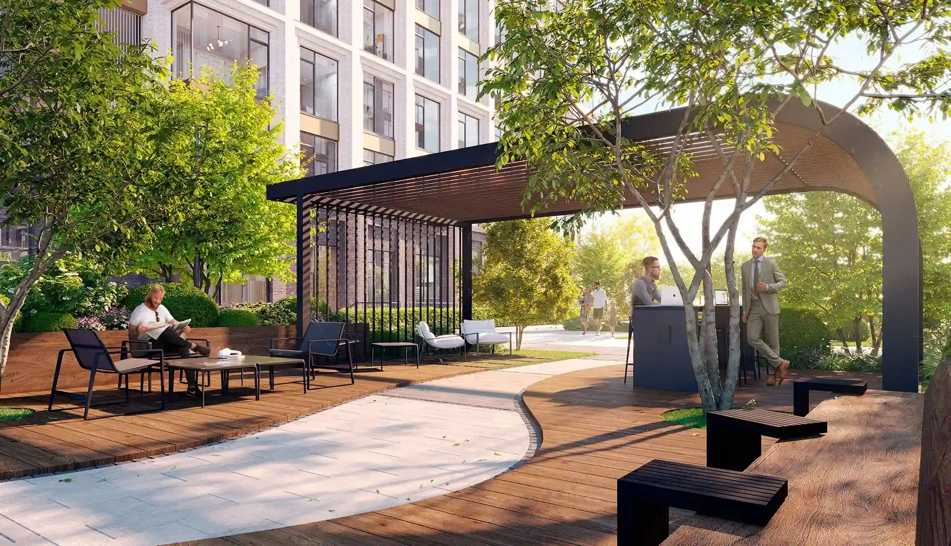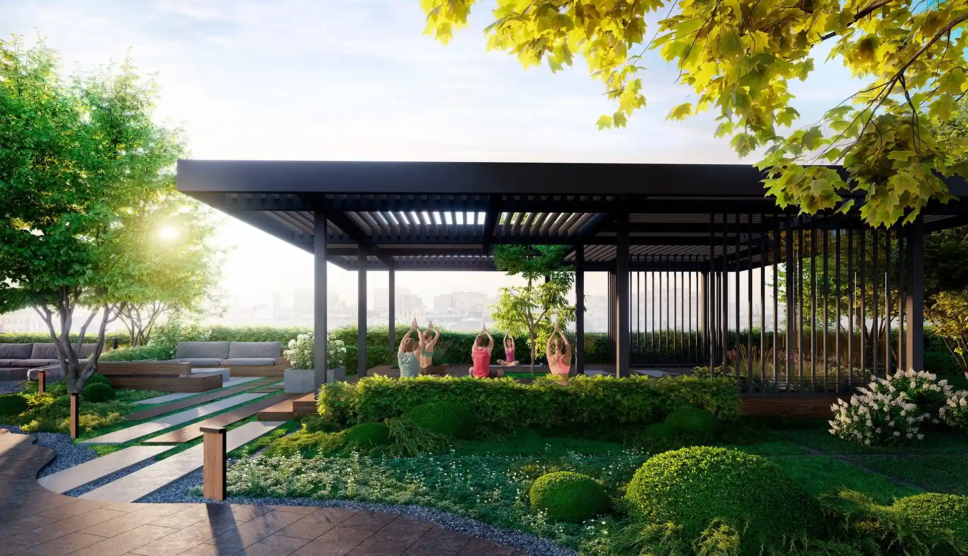 Особенность квартала — биокамины во дворе. Они позволят наслаждаться теплыми вечерами на свежем воздухе. А для большего комфорта предусмотрены подогреваемые лавки, что делает пребывание на улице приятным в любое время года.