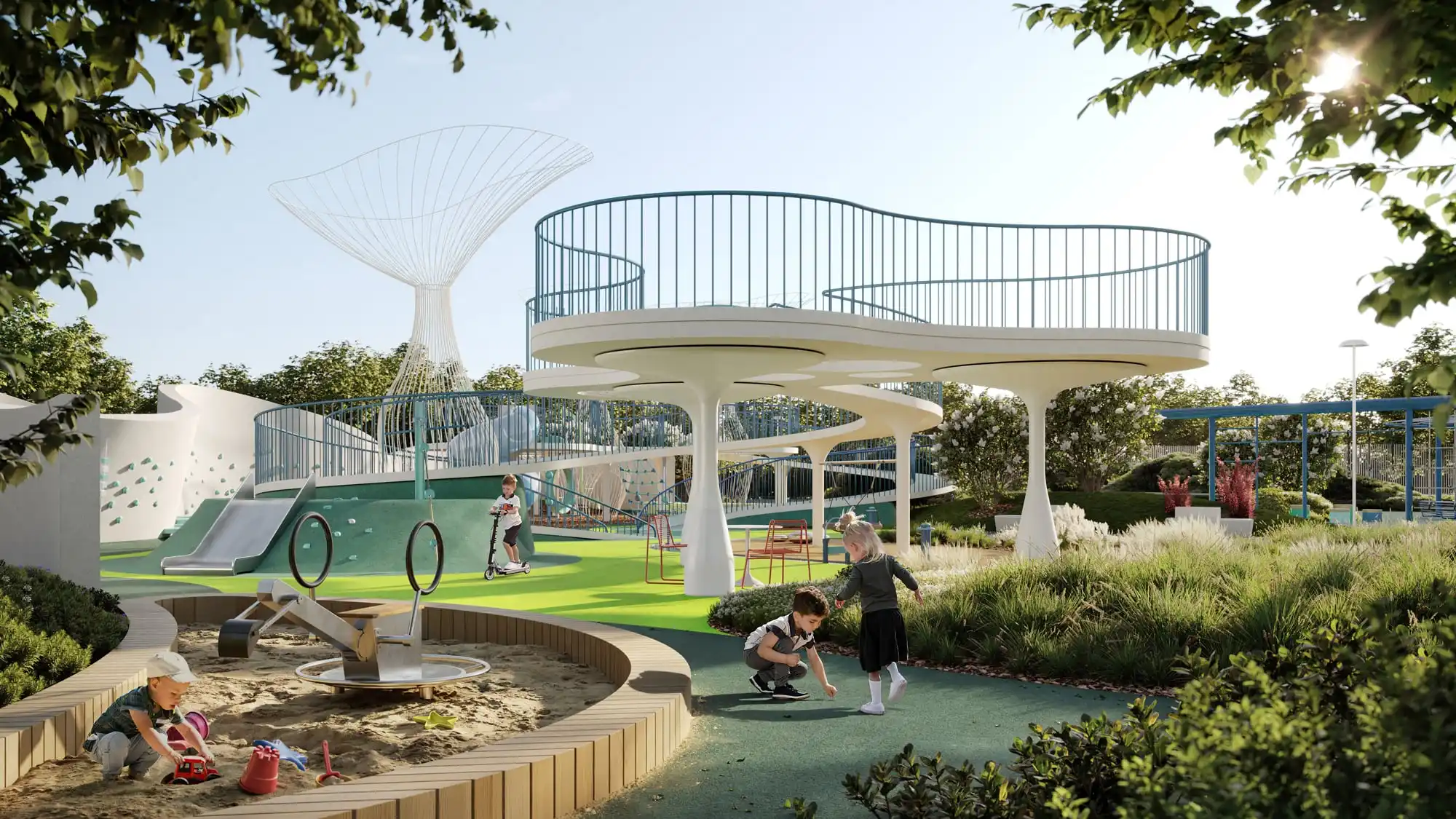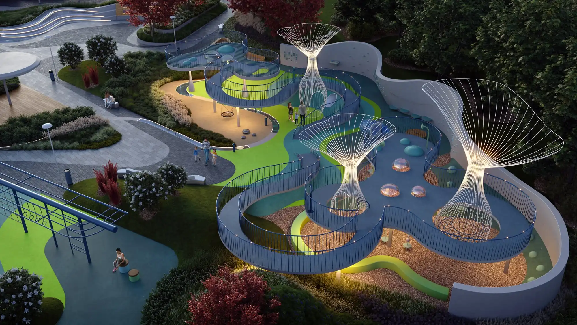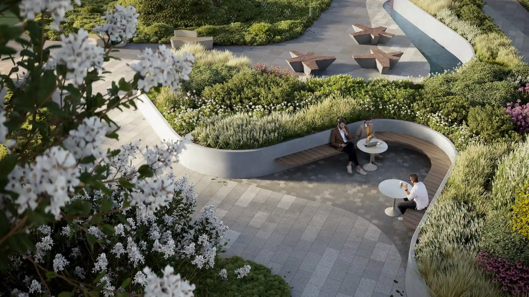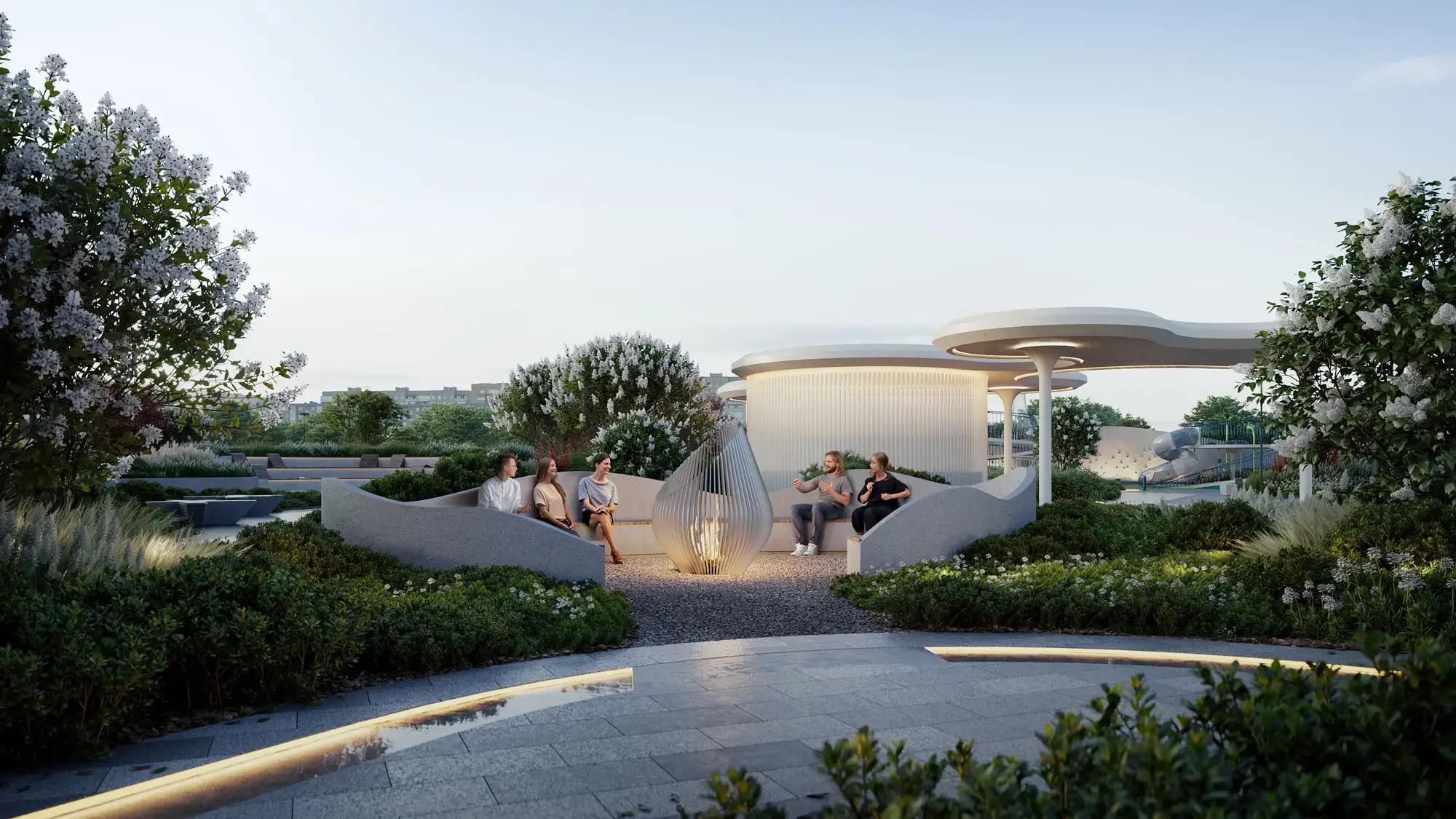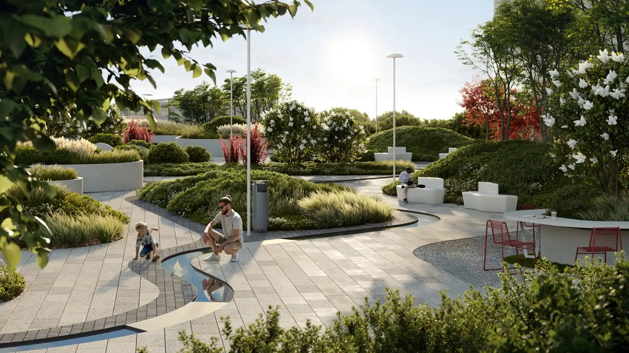 На территории сада предусмотрены 15 зон для отдыха, работы, спорта и детей. Знаковым местом станет центральная площадь с амфитеатром и водопадом — сочетание камней, растений и струящейся воды создает баланс с природой.