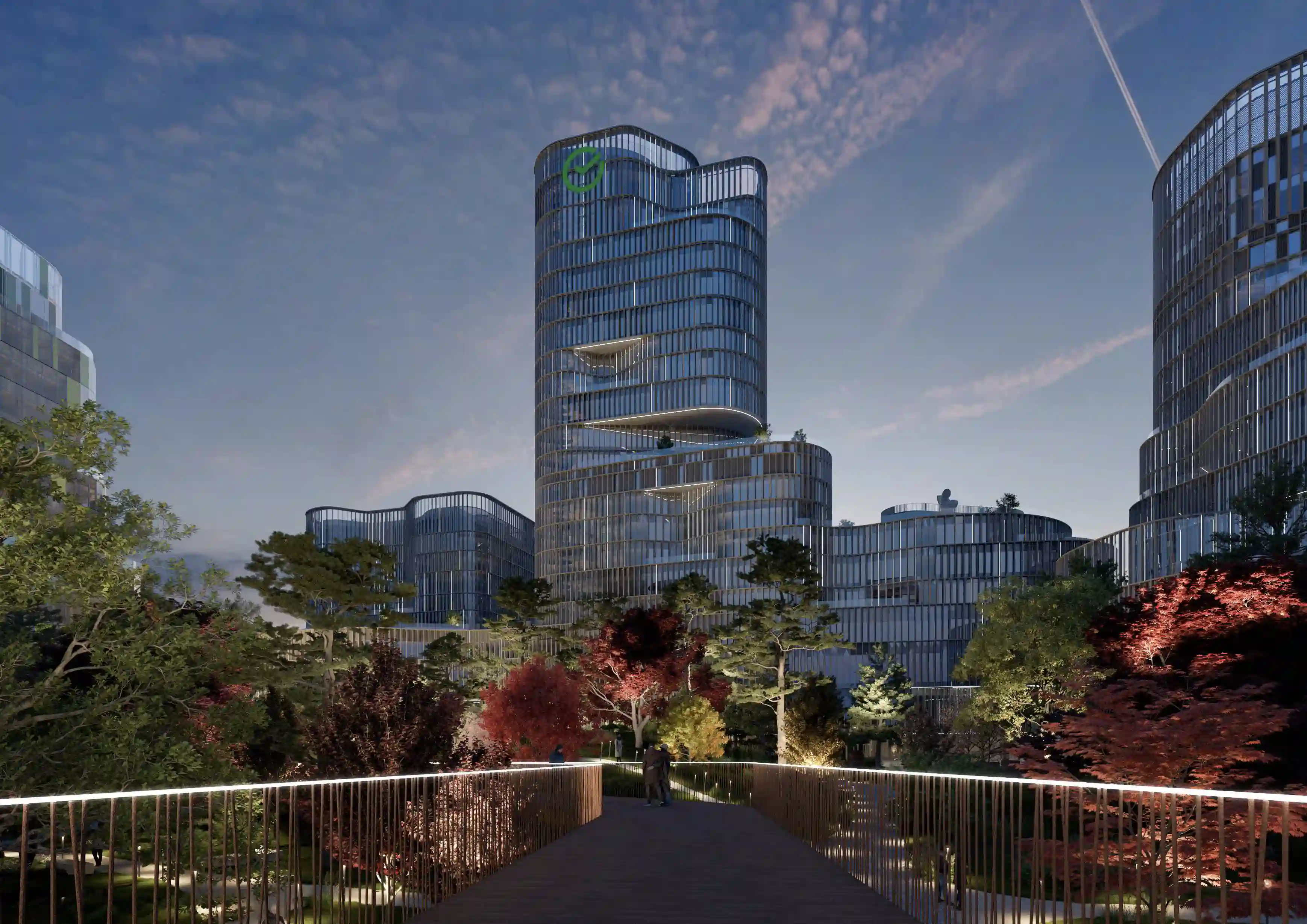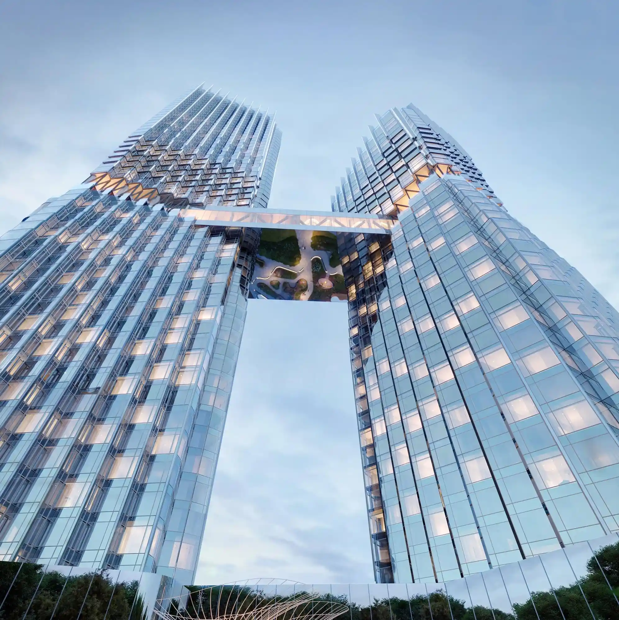 Архитектурной доминантой является мост, соединяющий башни на высоте 80 метров