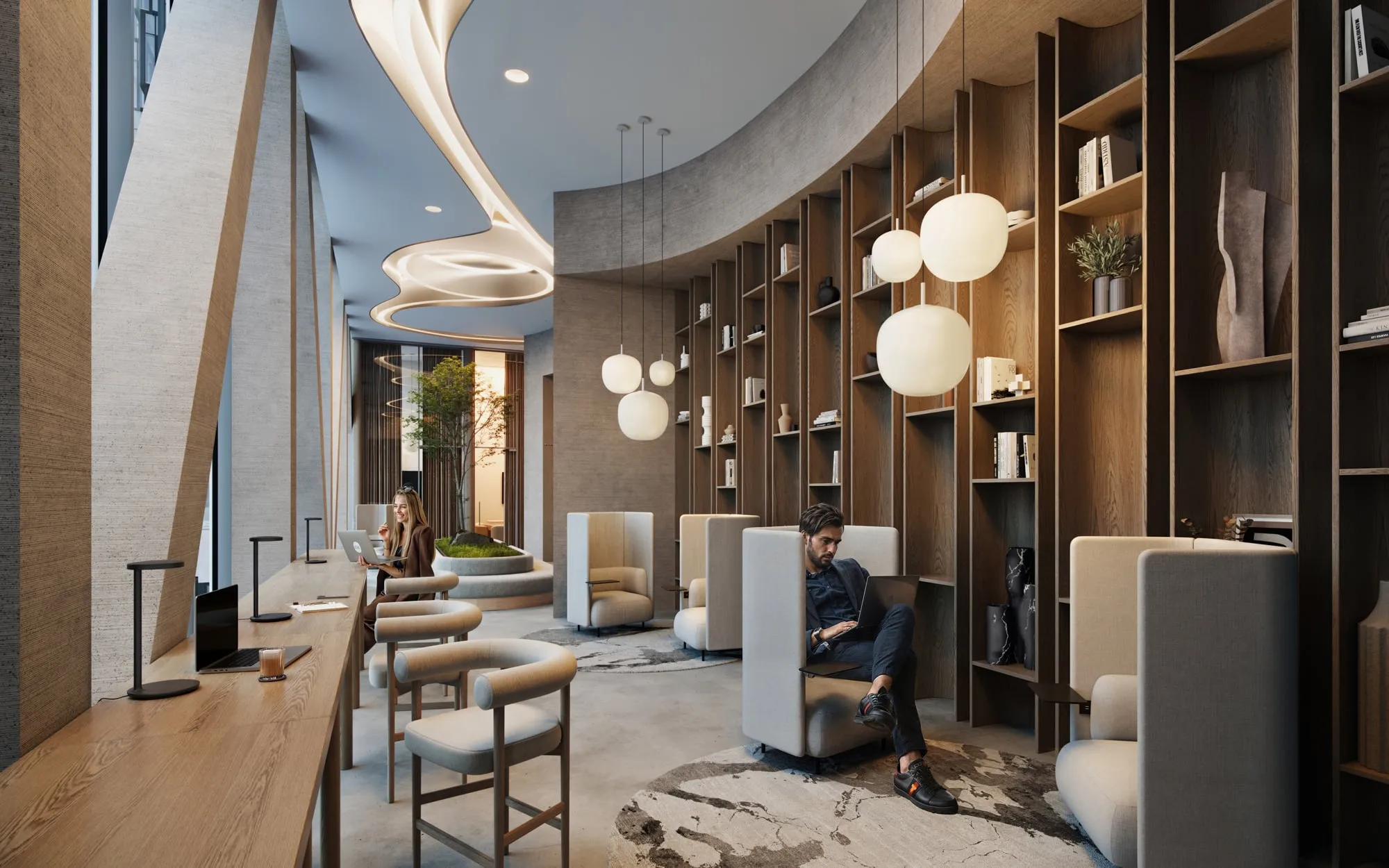 В центральной части моста расположен SocialHub, который включает 16 комфортных пространств для работы, отдыха и развлечений с панорамными видами на город